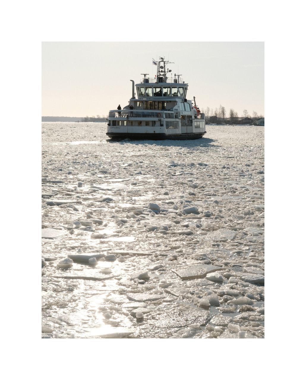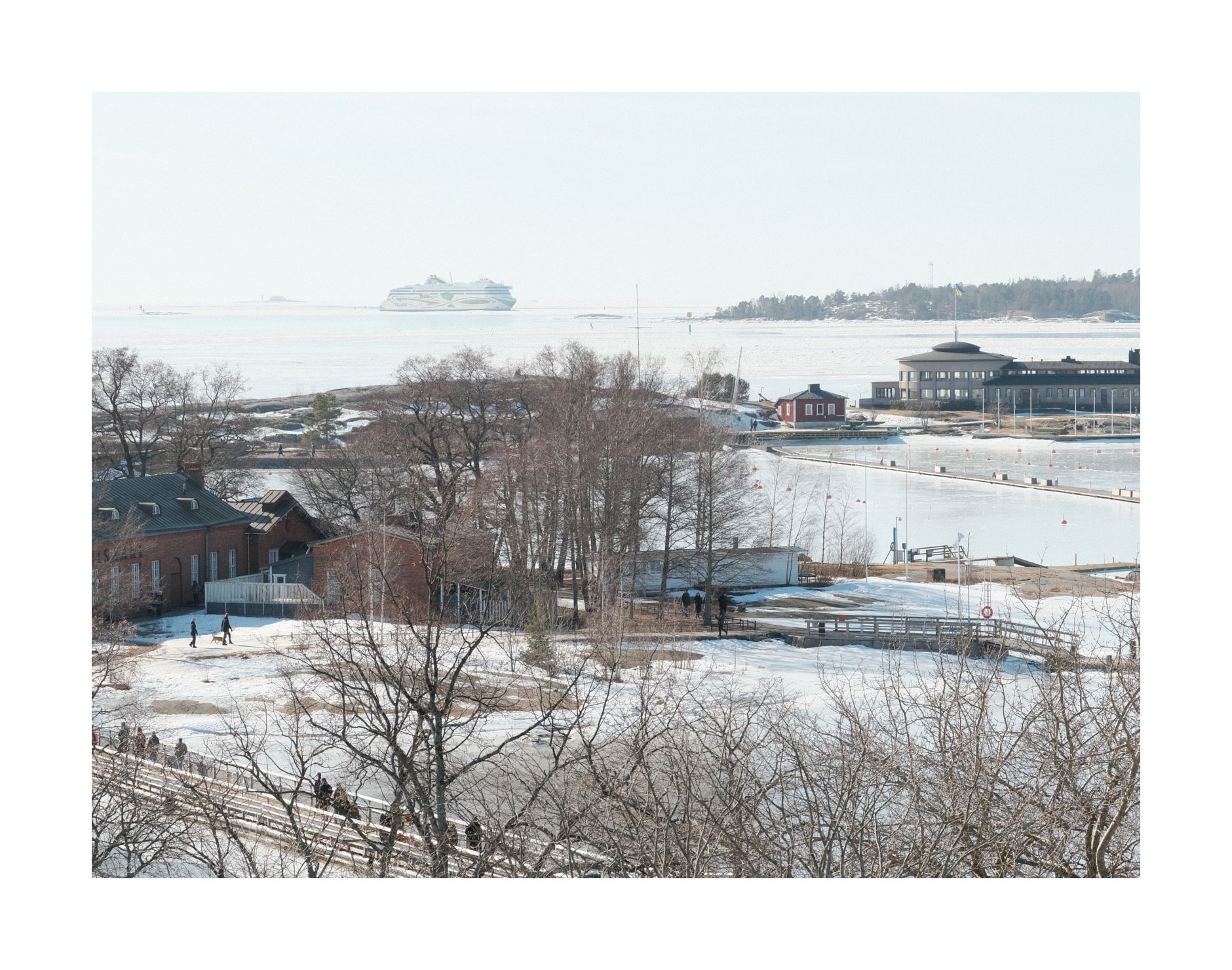 Ich gelange zum Hafen. Die Fähre nach Suomenlinna hat gerade abgelegt und stampft lautstark durch die schweren Eisschollen, die er Wasseroberfläche ein arktisches Antlitz verleihen. Ich merke mir, dass die Fähre alle 40 Minuten ablegt.