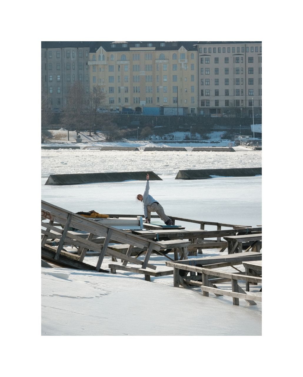 Eine junge Frau richtet sich in der Kälte ein und absolviert ein strammes Yoga-Programm. Da könnte sich so manche, deutsche Nordic-Walking-Matrone noch eine Scheibe von abschneiden...