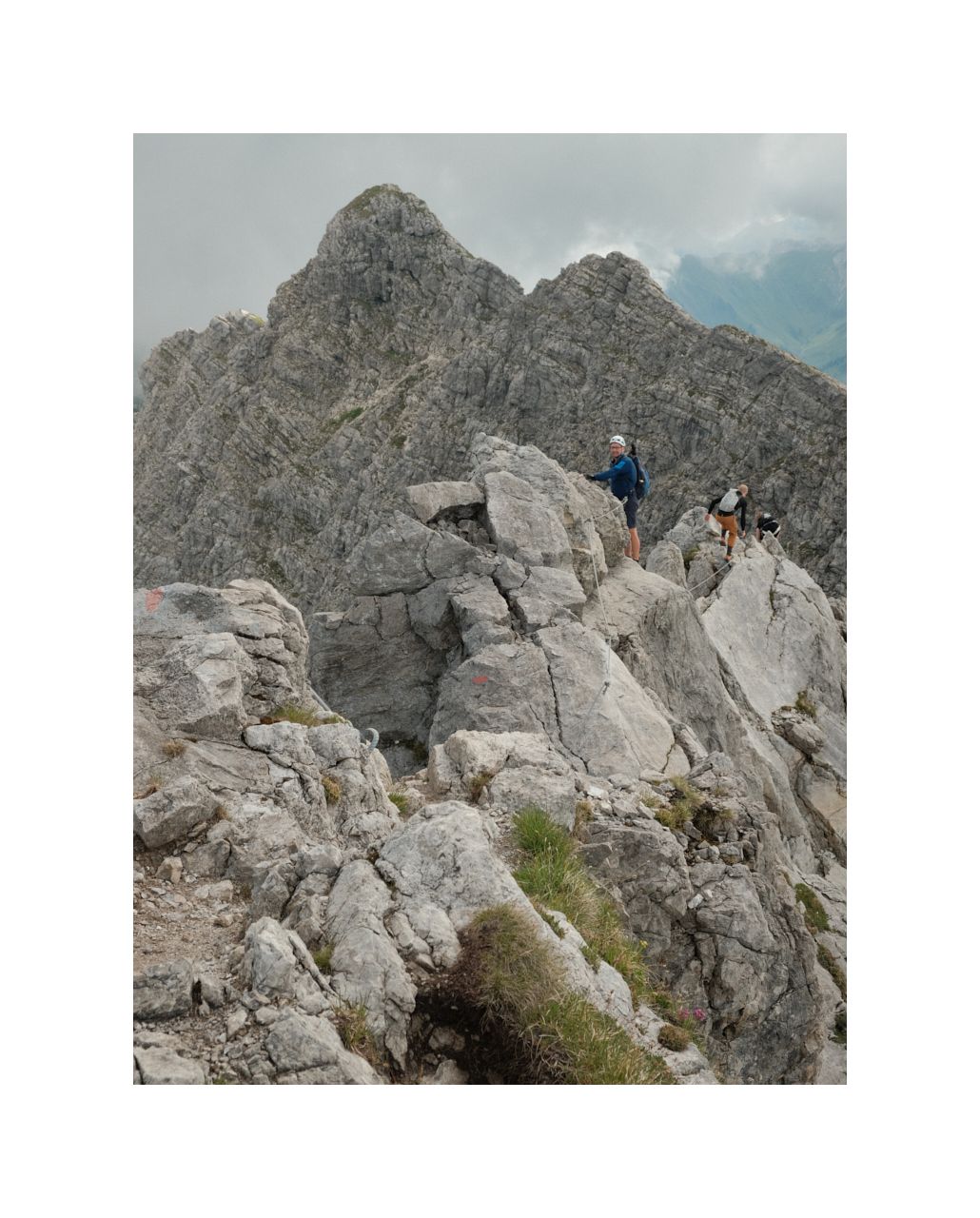 Während ich mir die Murmel aufs Haupt setze, biete ich dem Drängler hinter mir sogar den Vortritt an, weil 'i es ned mog, wenn man mia ins Genack steigt'. Nachdem das geklärt ist, verstehen wir uns für den Rest des Klettersteigs recht gut. Man muss halt miteinander reden!