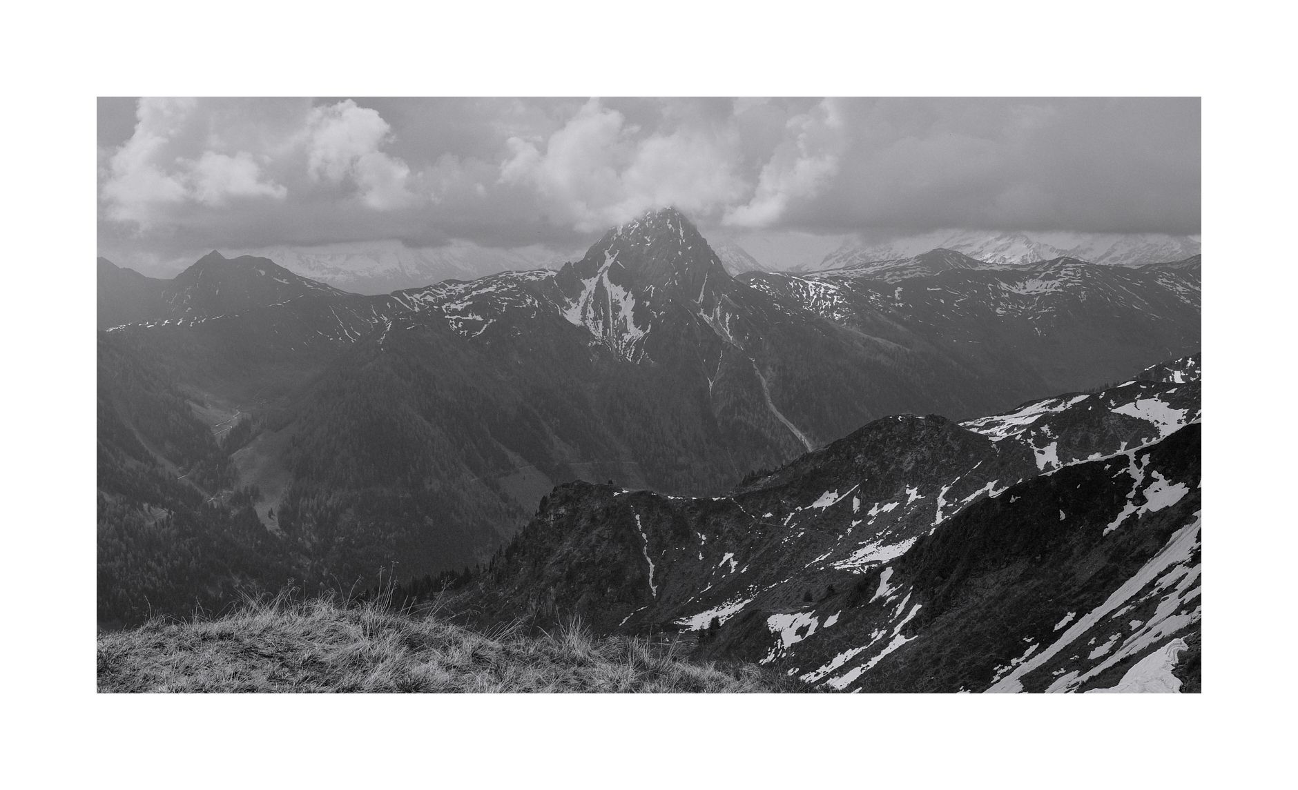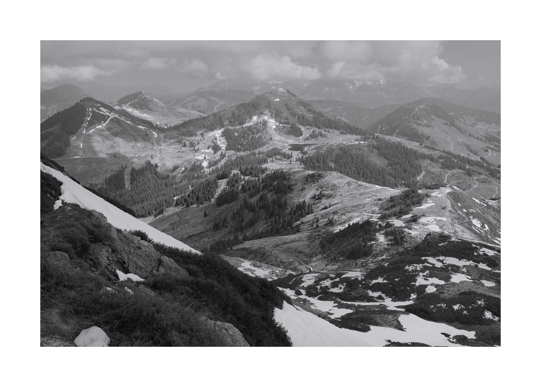Die Aussicht könnte bestimmt schön sein, nur ist sie es heute leider nicht. Es ist dunstig und selbst der an sich nahe Rettenstein ist nurmehr schemenhaft zu erkennen. Die hohen Berge verstecken sich hinter dichten und hohen Quellwolken. Kein Hoher Kaiser und keine Wildentauern heute! Der mögliche, weitere Weg zum Floch liegt noch größtenteils unter Schnee. Ich bin zwar früh dran, aber große Lust auf eine schlabbrige Fortsetzung dieser Wanderung habe ich nicht. Nach Käsebrot und Wasser ohne Luft prüfe ich nochmals die Karte. Vielleicht ist ja ein andere Rundweg möglich. Aber leicht, schnell oder kurz ist da gar nichts. Also gehe ich auf dem Anstiegsweg zurück und lasse mich dann später auf die öde Almstraße ein, nur damit der GPS-Track auch das hinreichend dokumentiert.