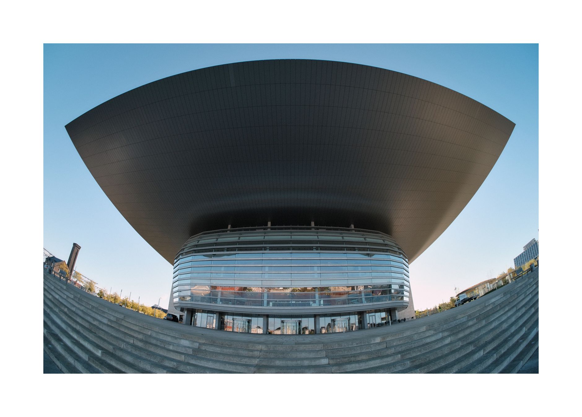 Eigentlich ist das innere einer Oper das, wo die Musik spielt (und auch das Wortspiel spielt?). Außen hätte ein Zweckbau genügt. Quadratisch, praktisch gut. Dennoch habe sich die Archtiekten anders entschieden. Die Glasfassade richtet sich zur Stadt hin aus und verleiht dem Gebäude ein gläsernes Gesicht, in dem sich die Stadt mannigfaltig spiegeln kann. Stadt und Oper werden durch Reflexion verbunden. Die Glasform ist ein Bruch mit strengen Formen. Auch das Äußere der Oper ist bereits Kunst. Das Dach hingegen überragt alles, das gesamte Gebäude. Die einfache, rechteckige Form dominiert das Umfeld. Das menschliche Auge versucht Linien zu vollenden, wo eigentlich keine sind, und ersinnt sich so einen schlichten Quader. Das ausladende Dach macht aus dem Äußeren der Oper wieder den Zweckbau, der es tatsächlich ist.