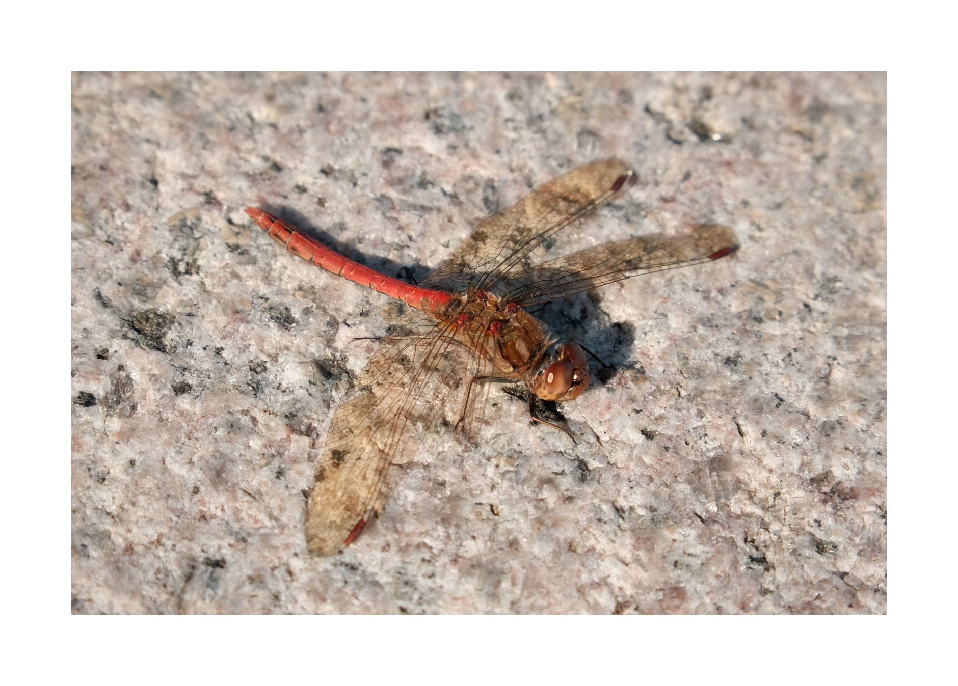 Noch ahne ich nichts von dem Trubel um die junge Dame, die keine Schuhe tragen kann. Ich bemerke noch die Kleingkeiten. Eine Libelle versucht im Sonnenlicht allerletzte Lebensgeister erneut zu wecken.