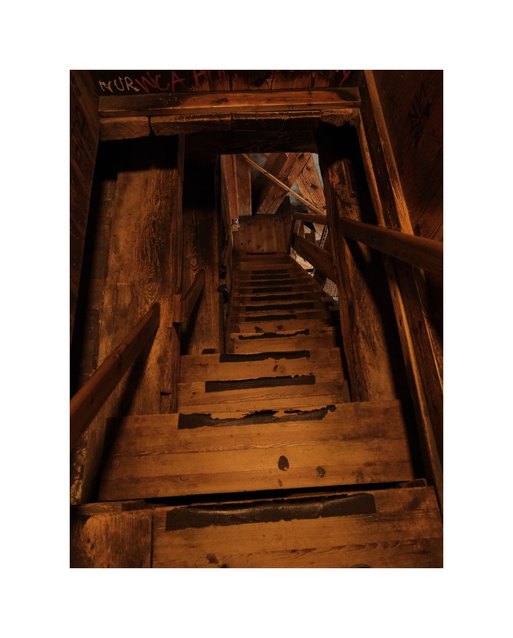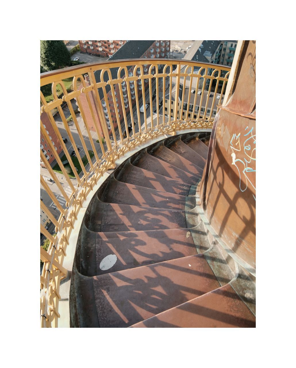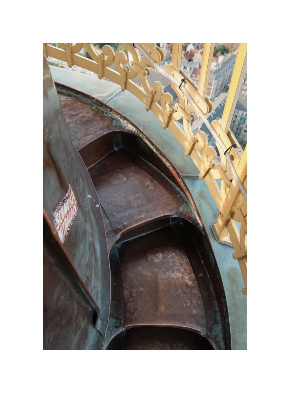 Ich bin sehr früh dran und das ist auch gut so. Der Aufstieg durch den Turm ist sehr eng. Bei adipösem Gegenverkehr würde man hier steckenbleiben. Erst nach 250 Stufen tritt man hinaus ins Licht auf den umlaufenden Balkon. Die letzten 150 Stufen auf dem äußeren, spiralförmigen Treppenaufgang sind nicht für jedermann gemacht. Beim Abstieg werde ich auf halbem Weg zwischen Umgang und Spitze einem jungen Mädchen gegegnen, das auf allen Vieren versucht sein Schockstarre zu überwinden. Ich hoffe lediglich, dass nicht plötzlich ein Gewitter aufzieht. Die Treppenstufen sind mit Kupferblech verkleidet...
