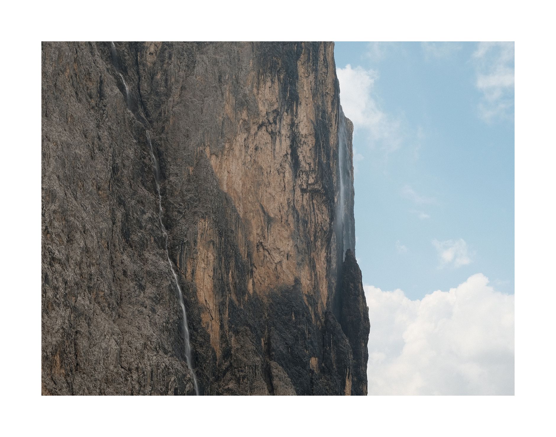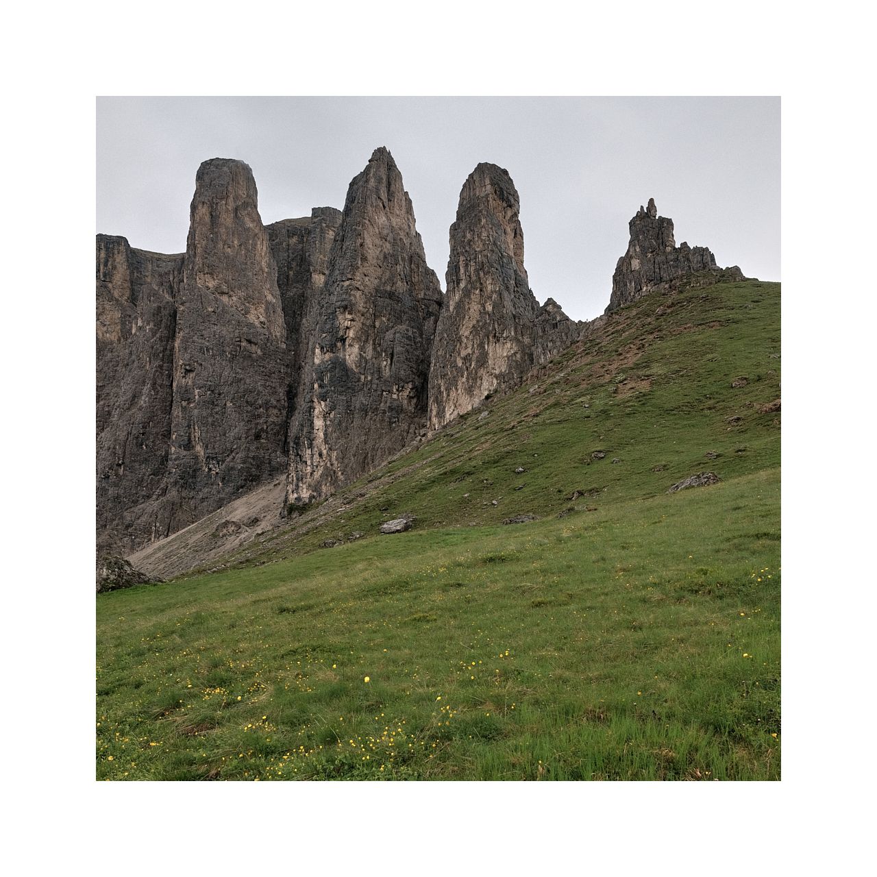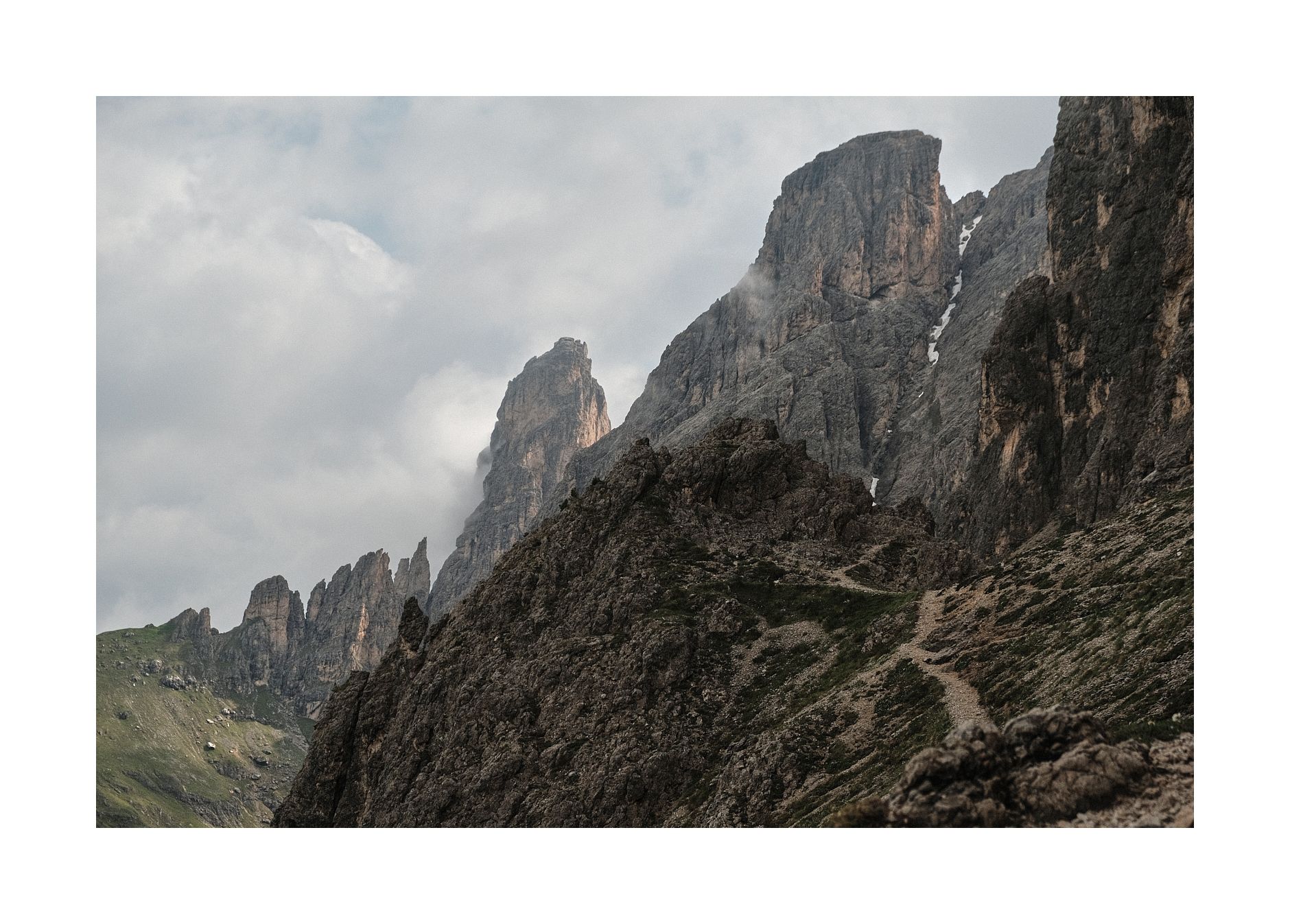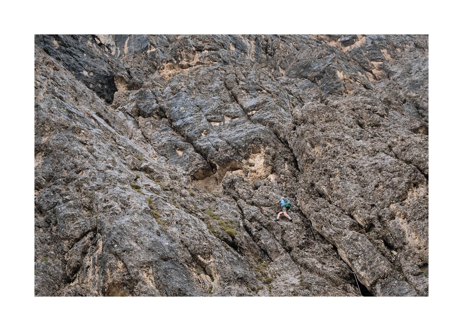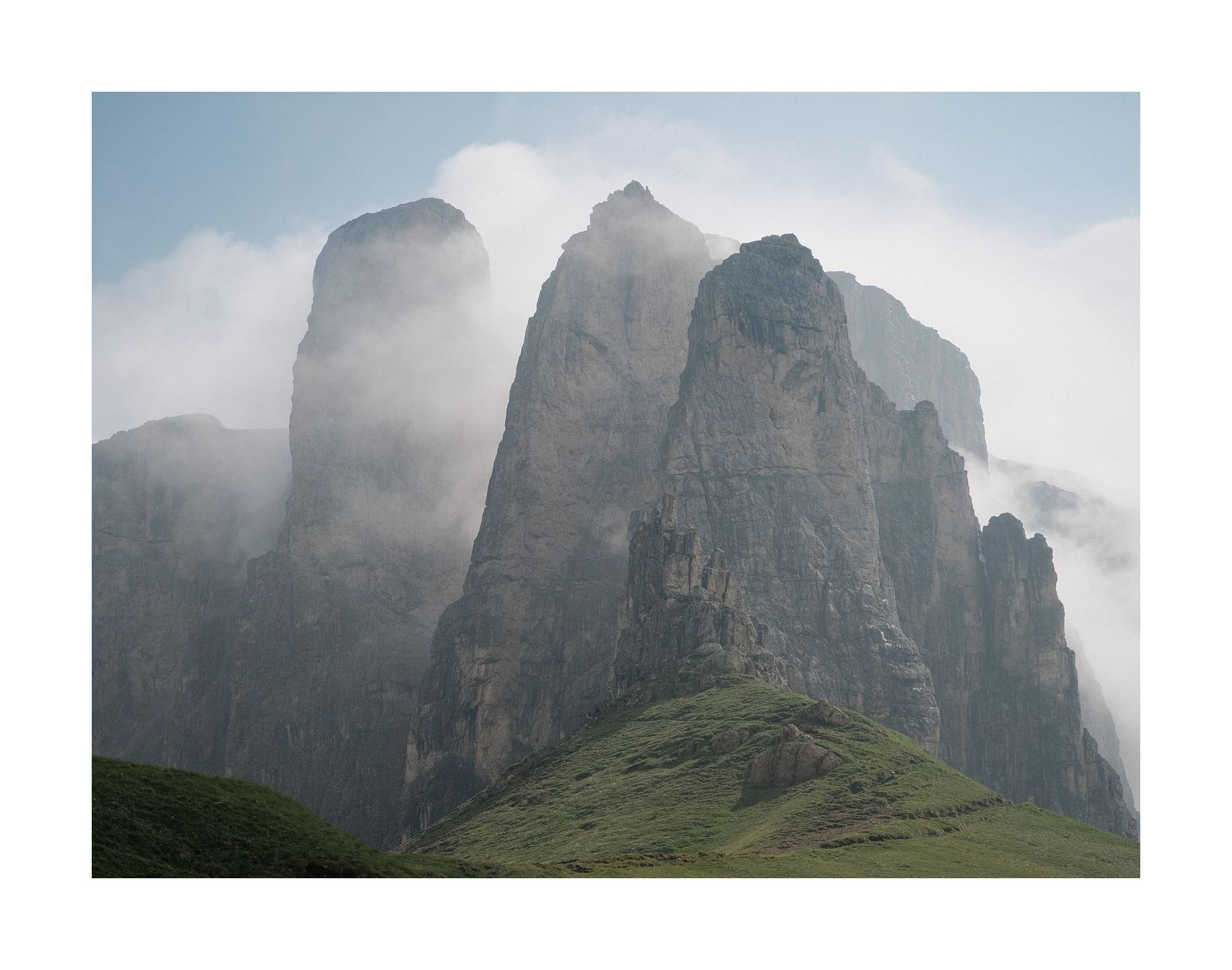 Als er ca. 25m über mir ist, fragt er mich, ob wir nicht heute zum Col Rodella könnten. Ich hatte gerade den teuren, alten Fotoapparat ausgepackt und bitte ihn noch ein paar Meter zu gehen, damit ich ein Foto machen kann. Ich sage: "Danke, Du kannst jetzt umdrehen." Er hört mich nicht und steigt unbeirrt weiter in die C/D-Verschneidung. Als er ums Eck verschwindet, mache ich mich auf den Weg zurück zum Sellajoch. Langsam lichtet sich der Nebel. Dabei entstehen meine besten Fotos dieser Gegend. 'Türme im Nebel' oder auch 'Geißler-Puez-Gruppe mit Nebelfetzen'. Definitiv Kandidaten für die Wand...
