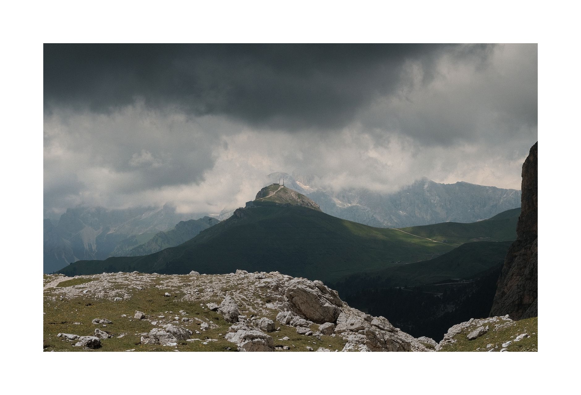 Am Tiefpunkt angekommen, biegen wir leider kurz falsch ab. Wir bemerken den Fehler jedoch bald, gehen zurück und nehmen den Gegenanstieg zum Sellajoch in Angriff. Erste Regentropfen fallen, es donnert und blitzt. Die Regenmonturen werden angelegt. Es strömt. Der kurzeste gezählte Abstand zwischen Blitz und Donner beträgt dreieinhalb Sekunden! Ein Traumtag würde anders enden. So lerne ich endlich auch einmal den Trockenraum der Rif. Valentini kennen.