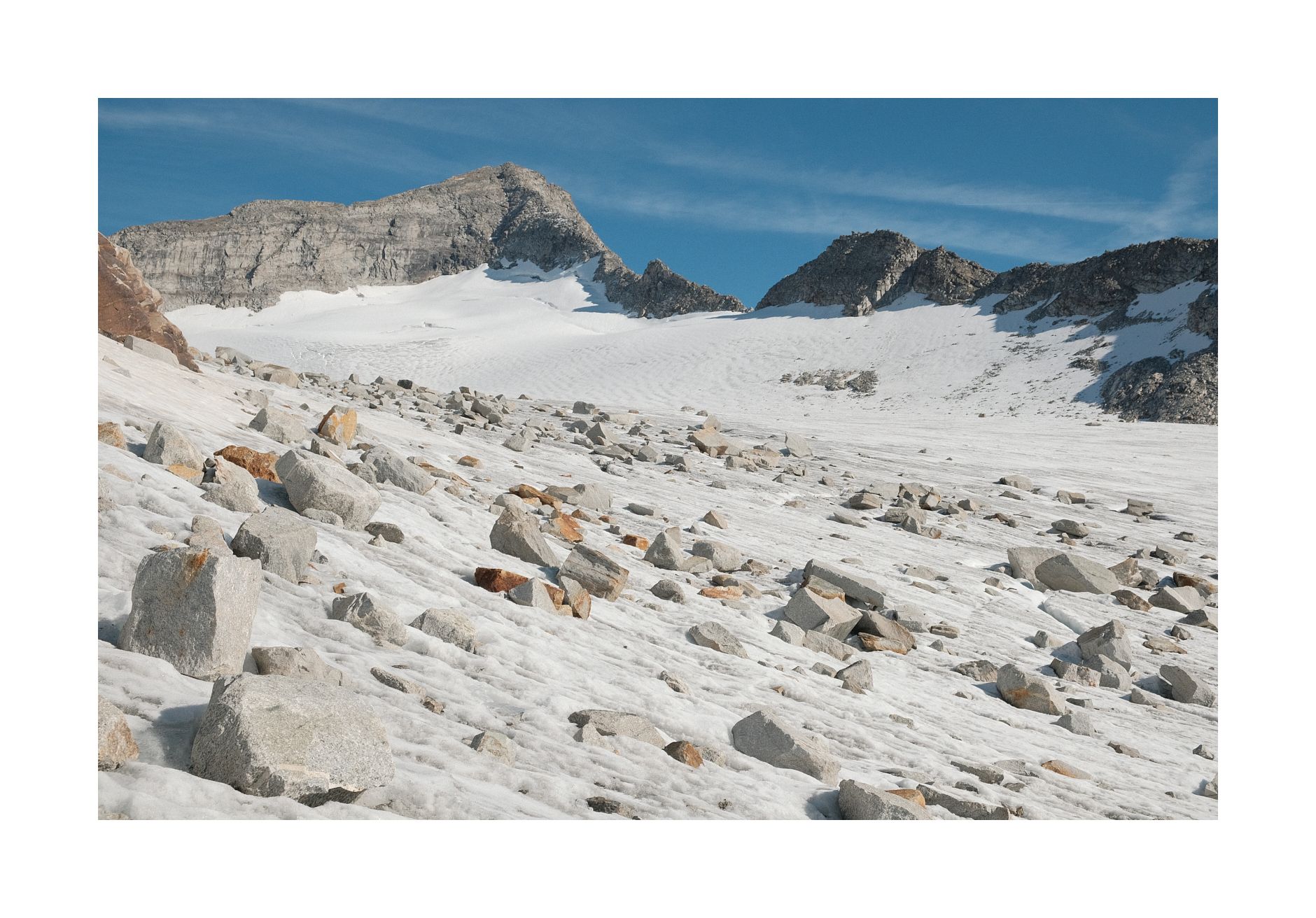 Von Bequem geht es gleich zu Blockgelände über. Farbtupfer fehlen völlig und nur viele verschiedene Steinmänner lassen verschiedenste Möglichkeiten entdecken. Die ruhige Oberfläche des kleinen Sees an der Schneescharte beruhigt zunächst meine schlaflose Seele, bevor ich das Stampflkees betrete. Gegenüber 1993 hat es deutlich an Masse verloren. Auch das Stampflkees ist auf dem besten Weg zu Toteis zu werden…