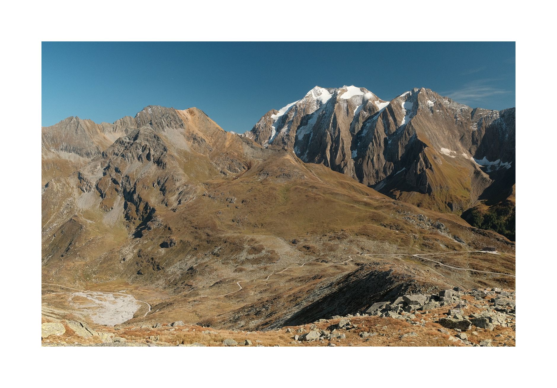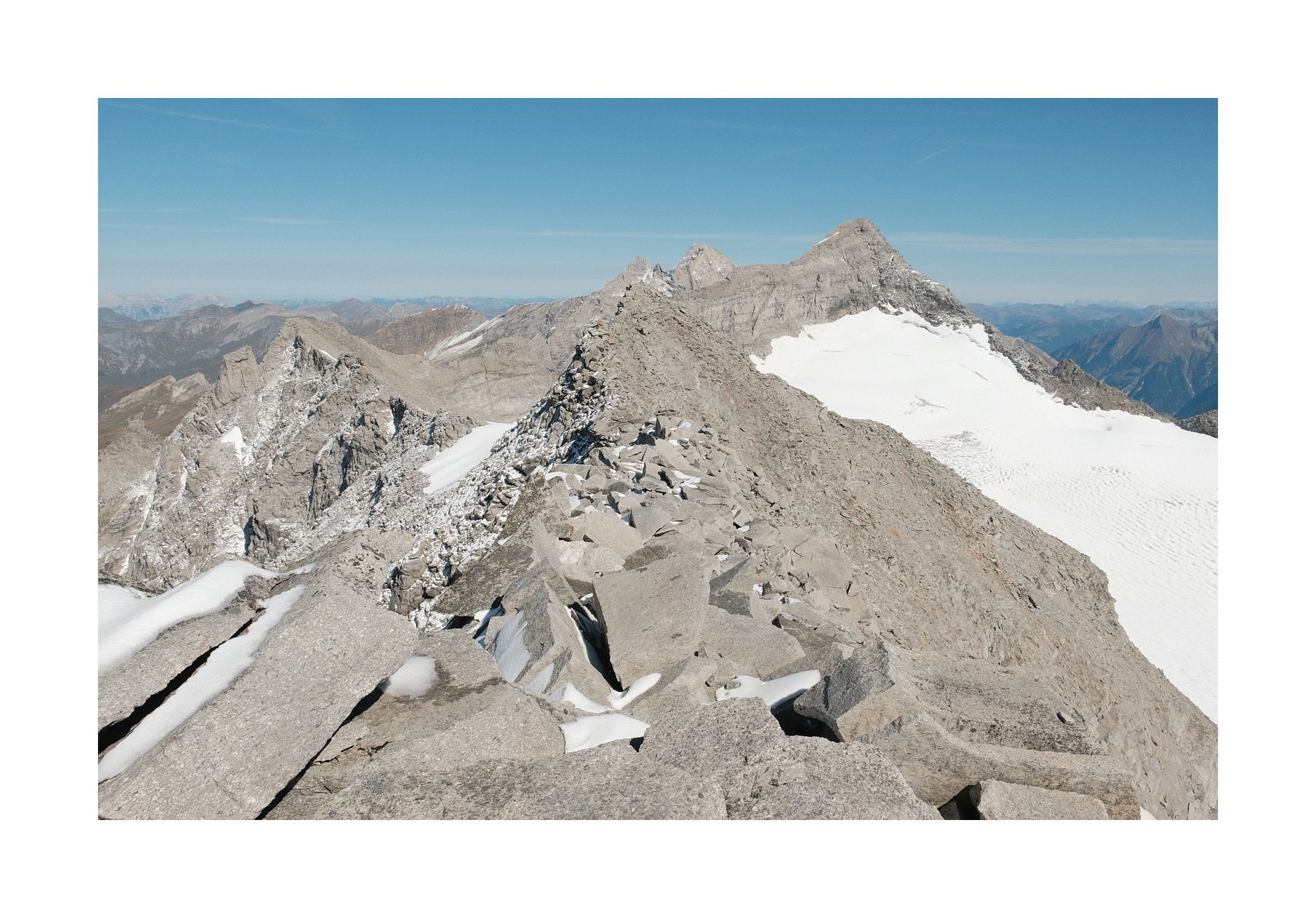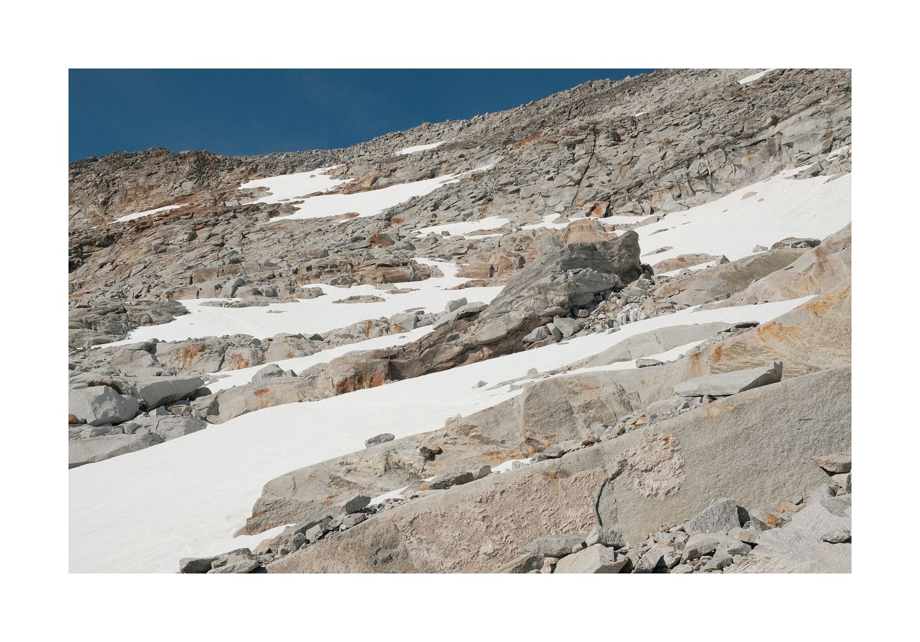 Ich biege ab in die Flanke der Hohen Wand. Schutt, Gletscherschliff und wieder Schutt. Die paar Schneefelder beschleunigen kaum etwas. Steinmänner sind nicht immer eindeutig. Zwei Schritte vor und einen zurückgerutscht. Ich bin mehrere Male kurz davor, einfach umzukehren und die Hohe Wand eine hohe Wand sein zu lassen. Mit viel Schimpfen und Jammern schaffe ich es dann aber doch in die Gratsenke zwischen Nord- und Südgipfel.