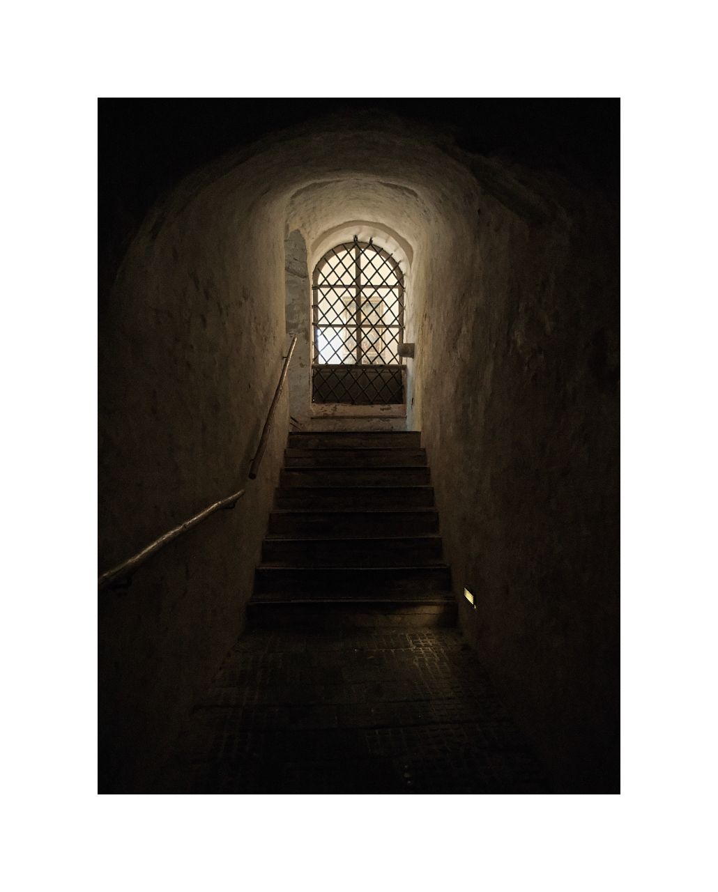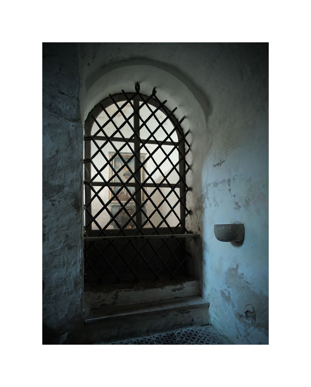 Meine Ideenlosigkeit bei der Fotografie mit Weitwinkelobjektiven ist kaum noch zu überbieten. Ein Verbindungstunnel links von der Kirche erweckt das Interesse. Hinterher ist mir auch klar, dass man mehr mit Licht und Schatten hätte spielen können. Das Fenster zu dem kleinen Altarraum hätte man in einer riesigen Schwärze platzieren können. Negativer Raum wäre sehr spannend. So aber war ich zu nah dran und auch zu gut belichtet. Mehr Abstraktion bitte, Zing!