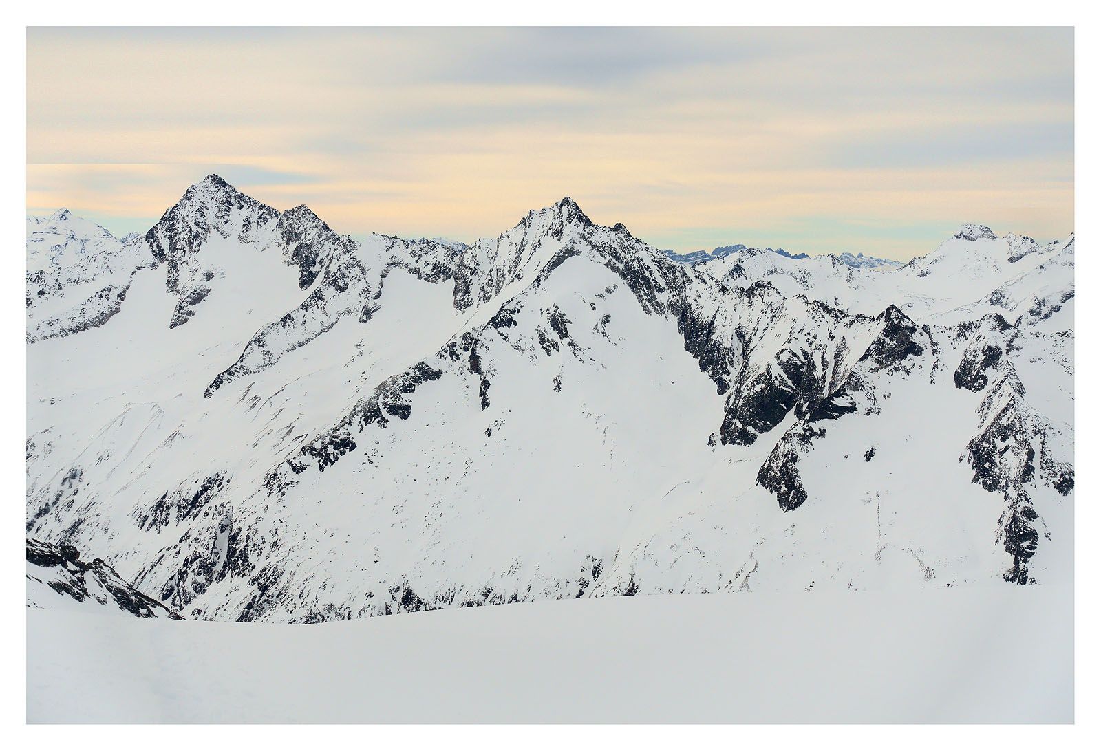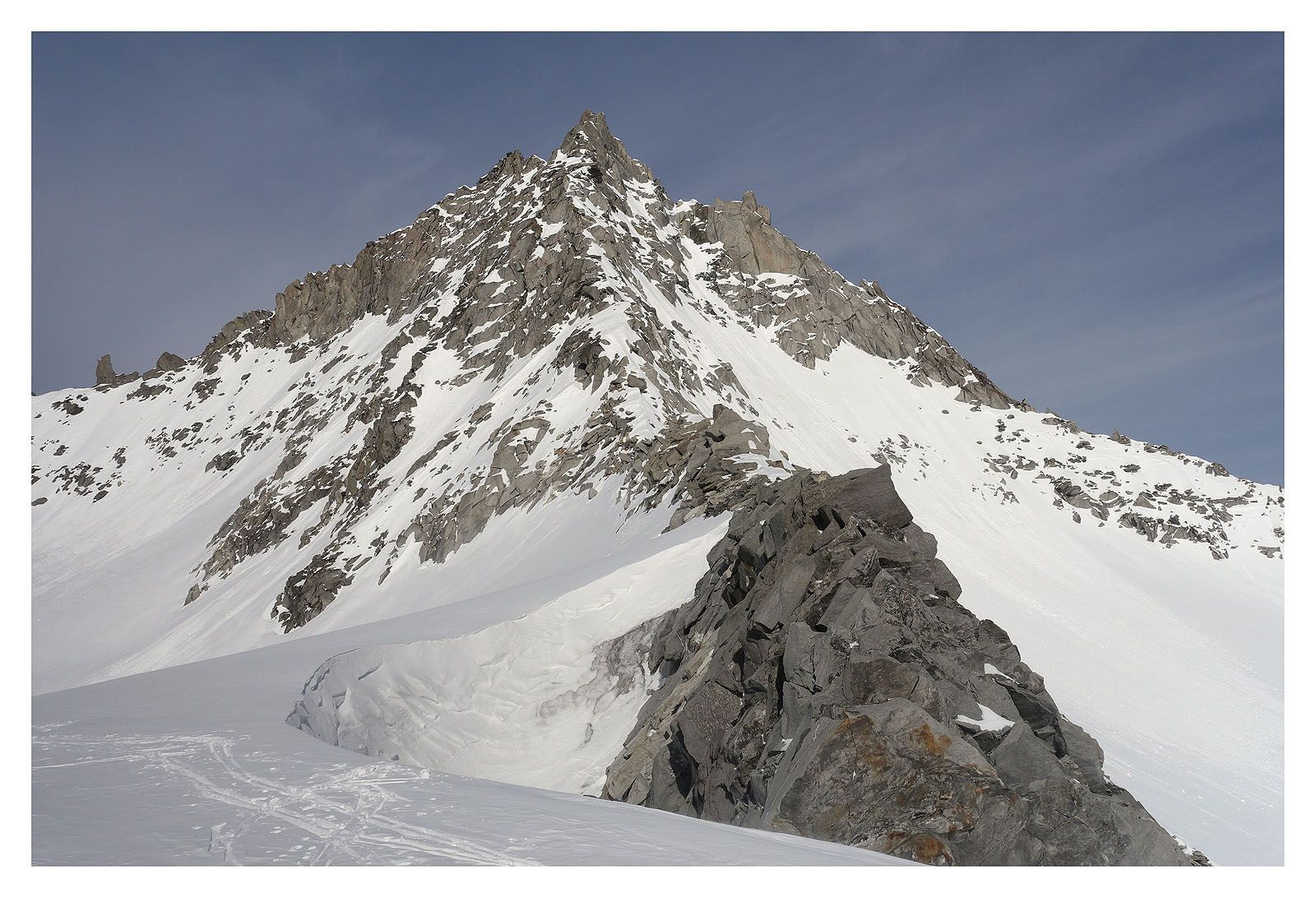 Als wir das Kuchelmooskees erreichen, seilen wir uns an. In einem eleganten und fragezeichenförmigen Schwung gewinnen wir das obere Firnbecken. Die Scharte, die man im Sommer ansteuert, lassen wir nun links liegen. Wir steigen auf einer Schneerampe so lange auf, bis es nicht mehr geht. Dann geht es zu Fuß weiter über eine flache Kuppe auf eine Geländeschulter und zuletzt unschwierig (I) auf den Gipfel.