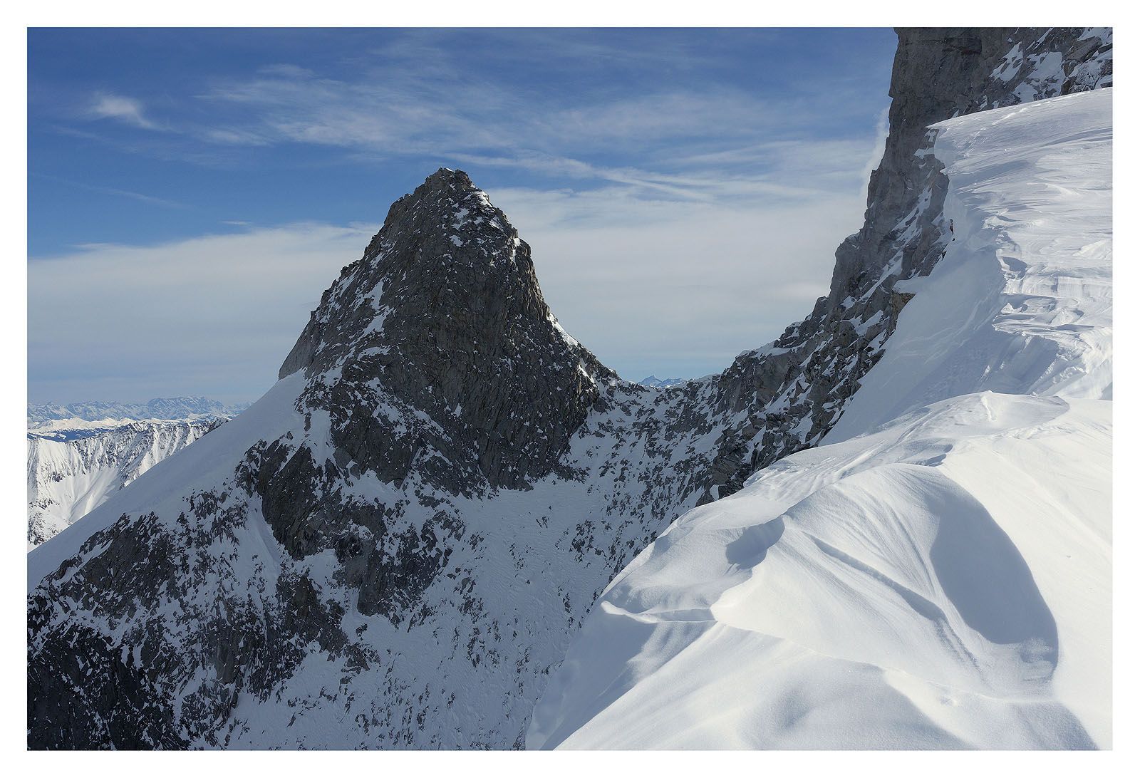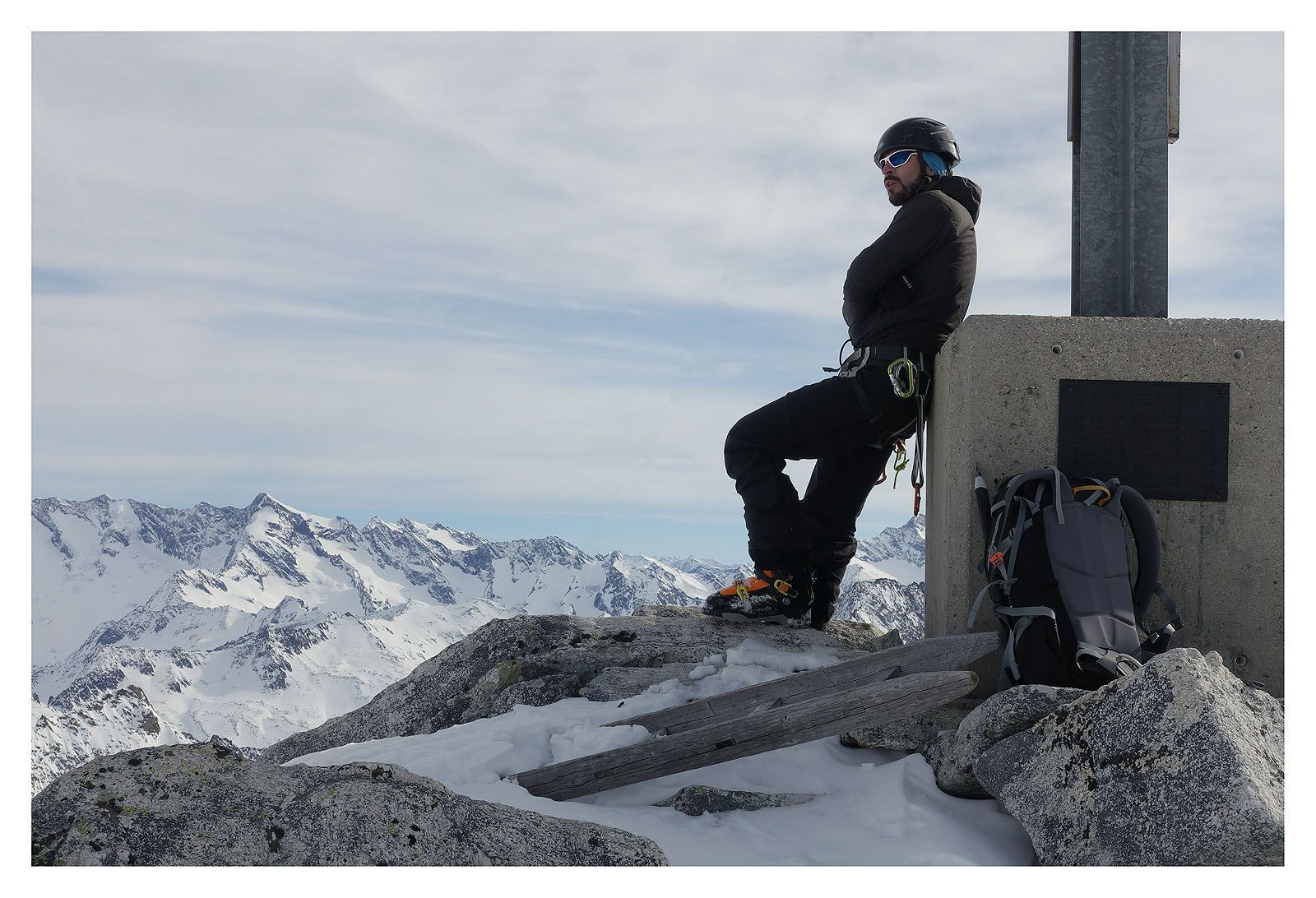 Der strenge Wind lädt leider nicht zu längerem Verweilen auf der Reichenspitze ein. Beim Materialdepot treffen wir drei vereinzelte Tourengeher. Mehr Menschen werden wir hier und heute nicht begegnen.
