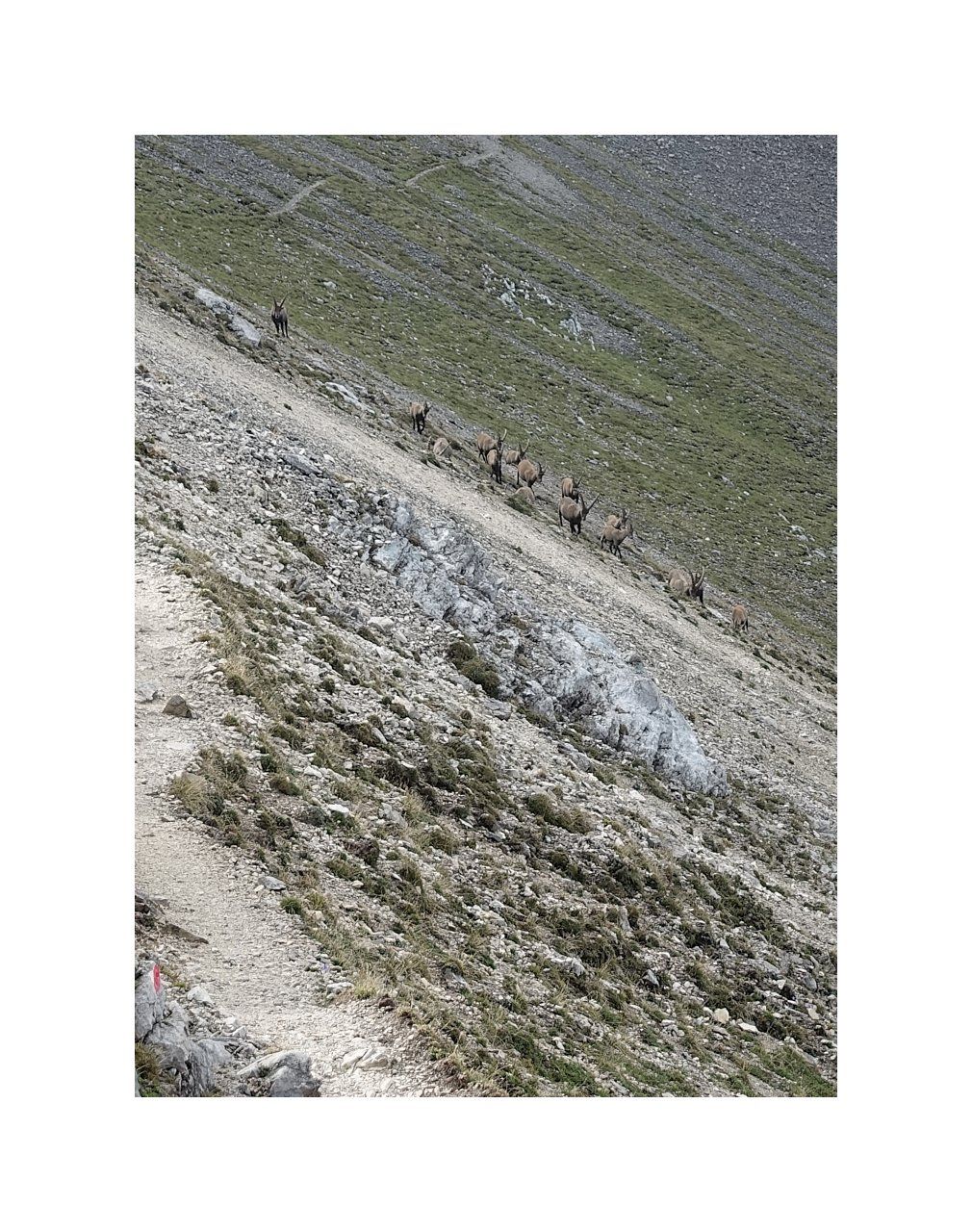 Zurück geht es wieder über die winzige Einschnürung im Grat. Beim zweiten Mal ist der eine Schritt schon gar nicht mehr so weit. Wir begegnen wieder den Steinböcken, die völlig unbeeindruckt ihr Ding machen. Die ersten Bersteiger kommen uns in Scharen entgegen. Jetzt ist Schluss mit der Stille am Berg.