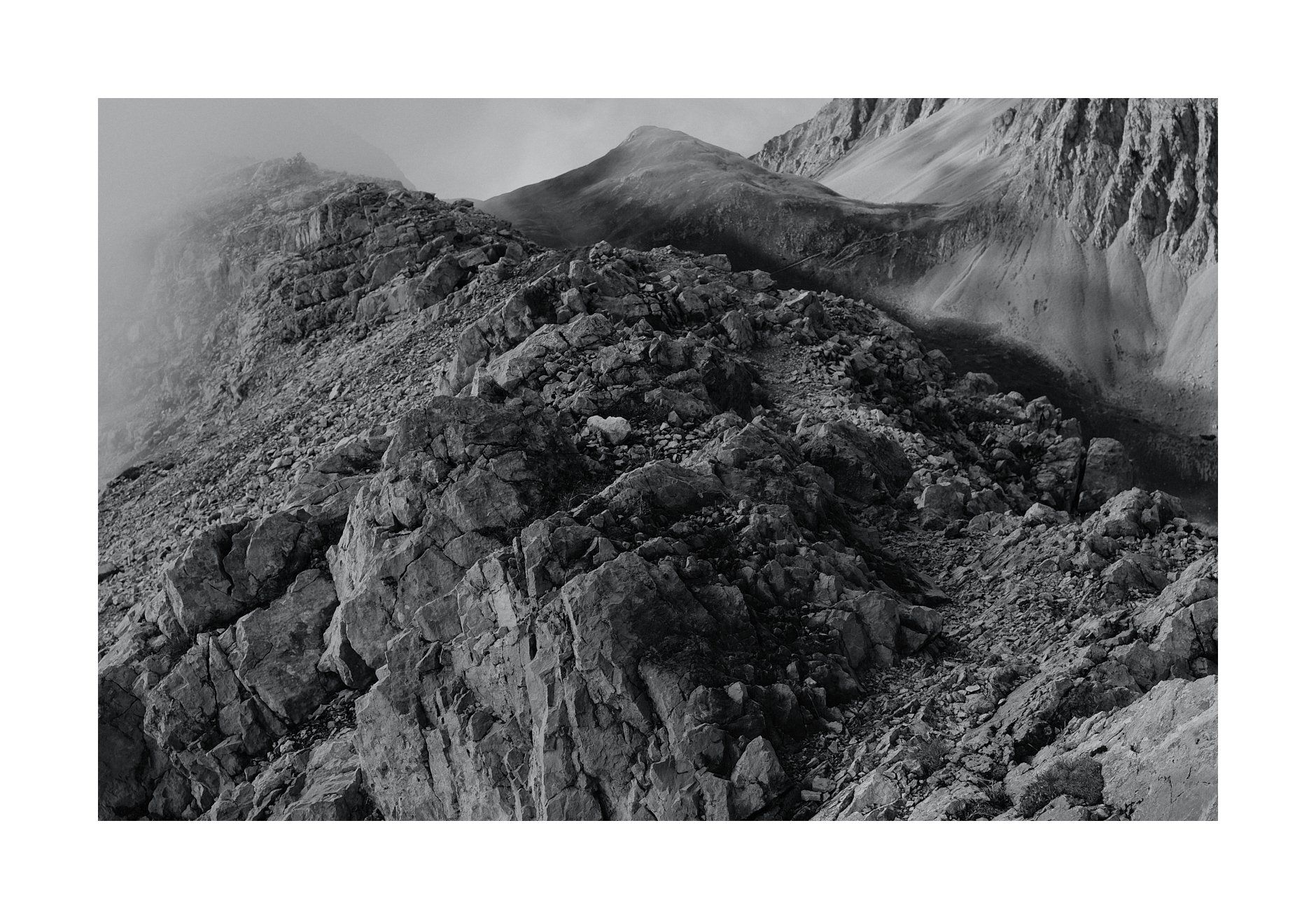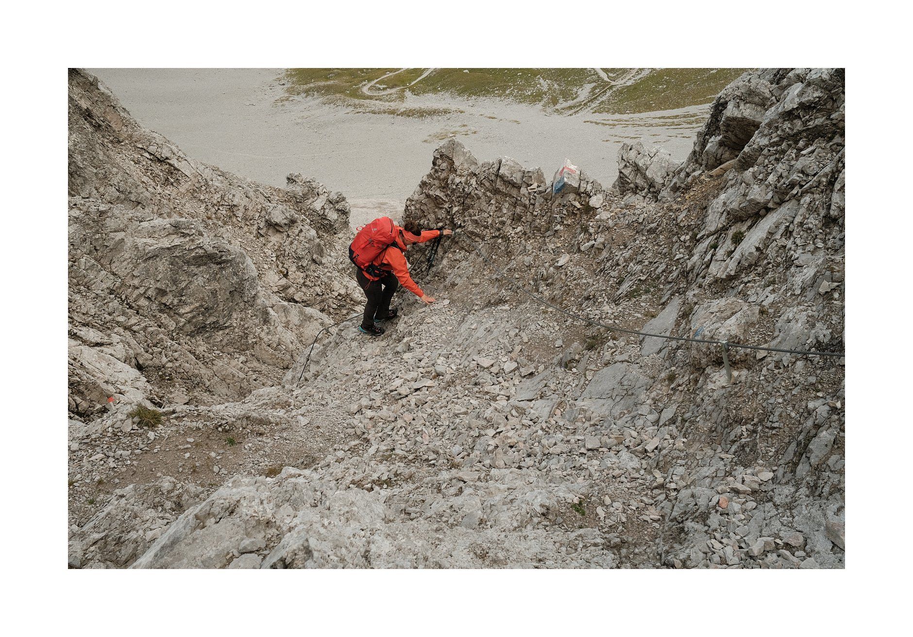 Über steiles Gras verlassen wir die Pfeiserspitze an einem schlaffen Drahtseil abwärts. Als das Gras endet findet man sich auf einer Felsrippe wieder. Zu beiden Seiten pfeift es abwärts. Zumindest vermute ich das hinter den dichten Nebelschwaden. Man erreicht in umständlichem Zickzack eine Scharte und muss auf der anderen Seite wieder ambitioniert aufsteigen. Sehr fotogene Stelle. Danach wird es leichter wenn auch nicht weniger ausgesetzt. Die Hänge sind steil. Zum ersten Mal kommt die Frage auf, ob wir denn bald da seien. Nun, 'da' ist eine zu unspezifische Fragestellung. Ein 'ja schon' ist die angemessene Antwort...