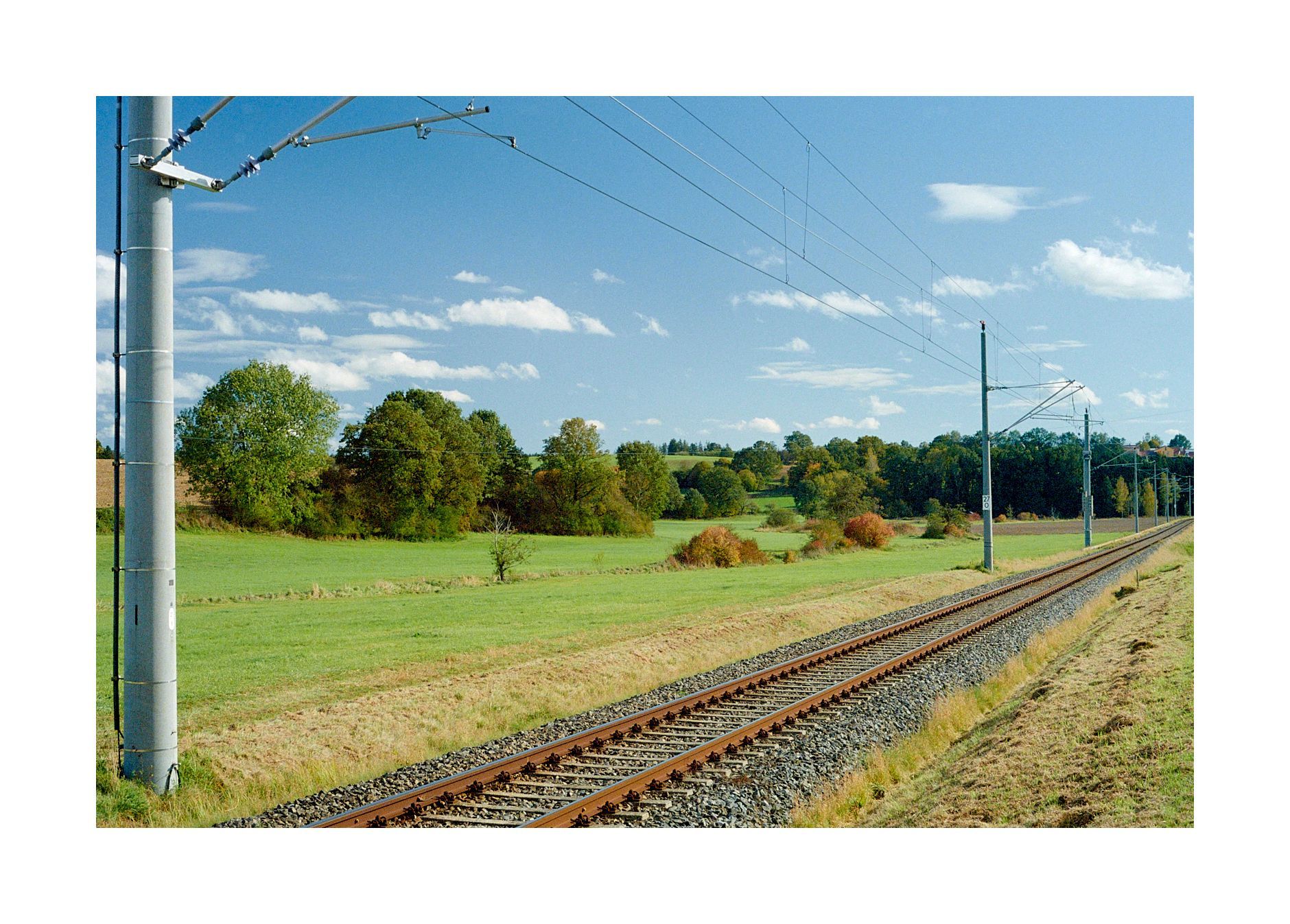 Dann aber stoße ich auf die Überfahrt über einen Bach. Eine Pegelhütte mit rötlichem Dach steht daneben. Die Uferböschung liefert mit ihrem üppigen Bewuchs einen schönen Vordergrund, der den Blick in die Szene und auf das Motiv lenkt. Auch eine Hintergrund, der nicht nur aus blauem Himmel besteht, ist vorhanden. Ich spüre wieder dieses Hochgefühl, wenn einem der Blick durch den Sucher bereits zeigt, dass hier ein ganz wertvolles Bild entsteht. Wenn mir bloß nicht der LOMO 400 mit seinen schrägen Farben einen Strich durch die Rechnung macht.