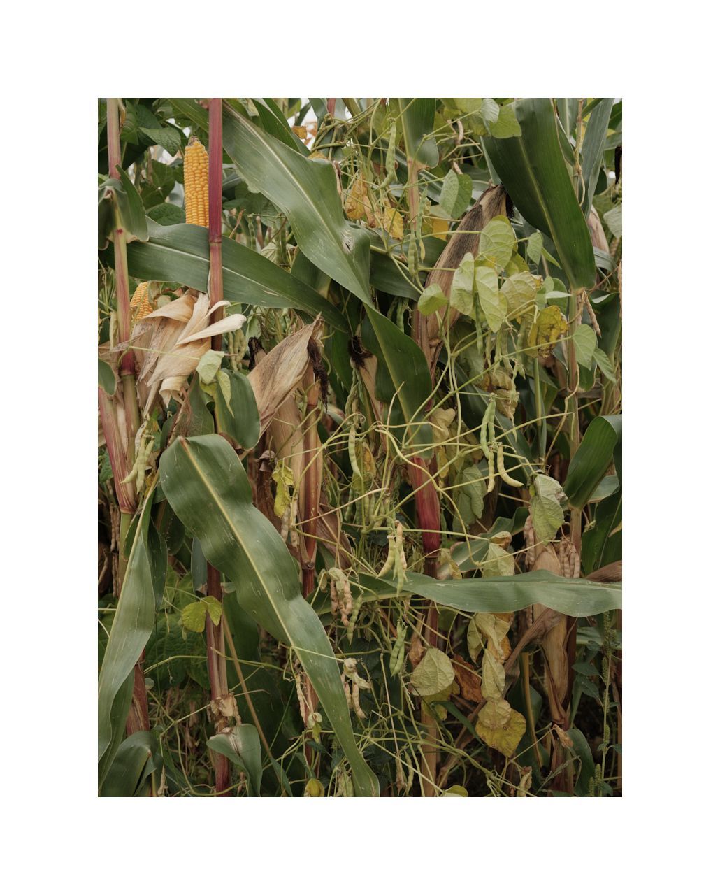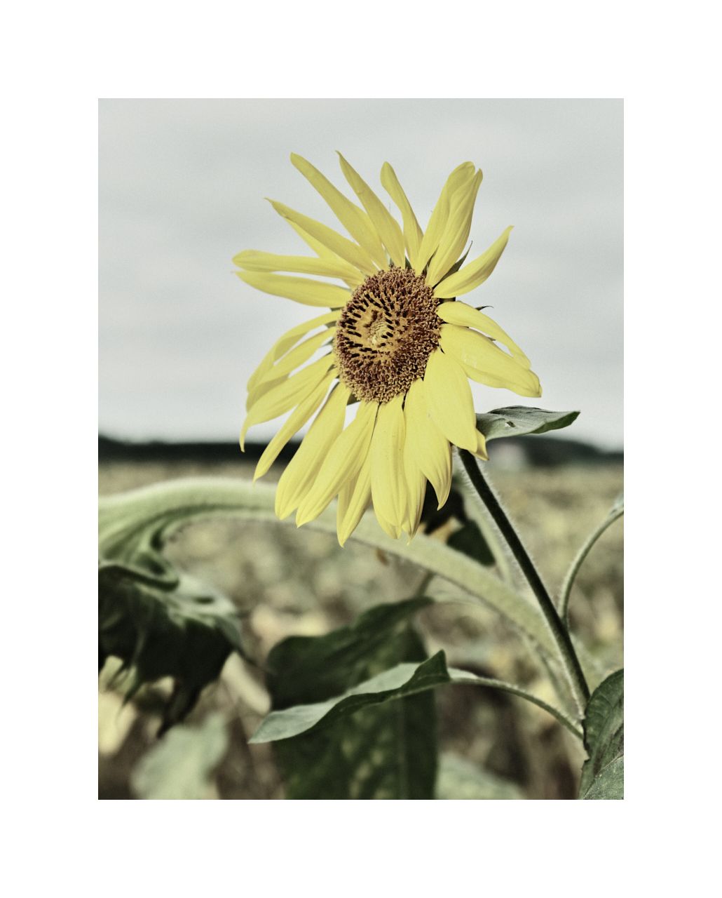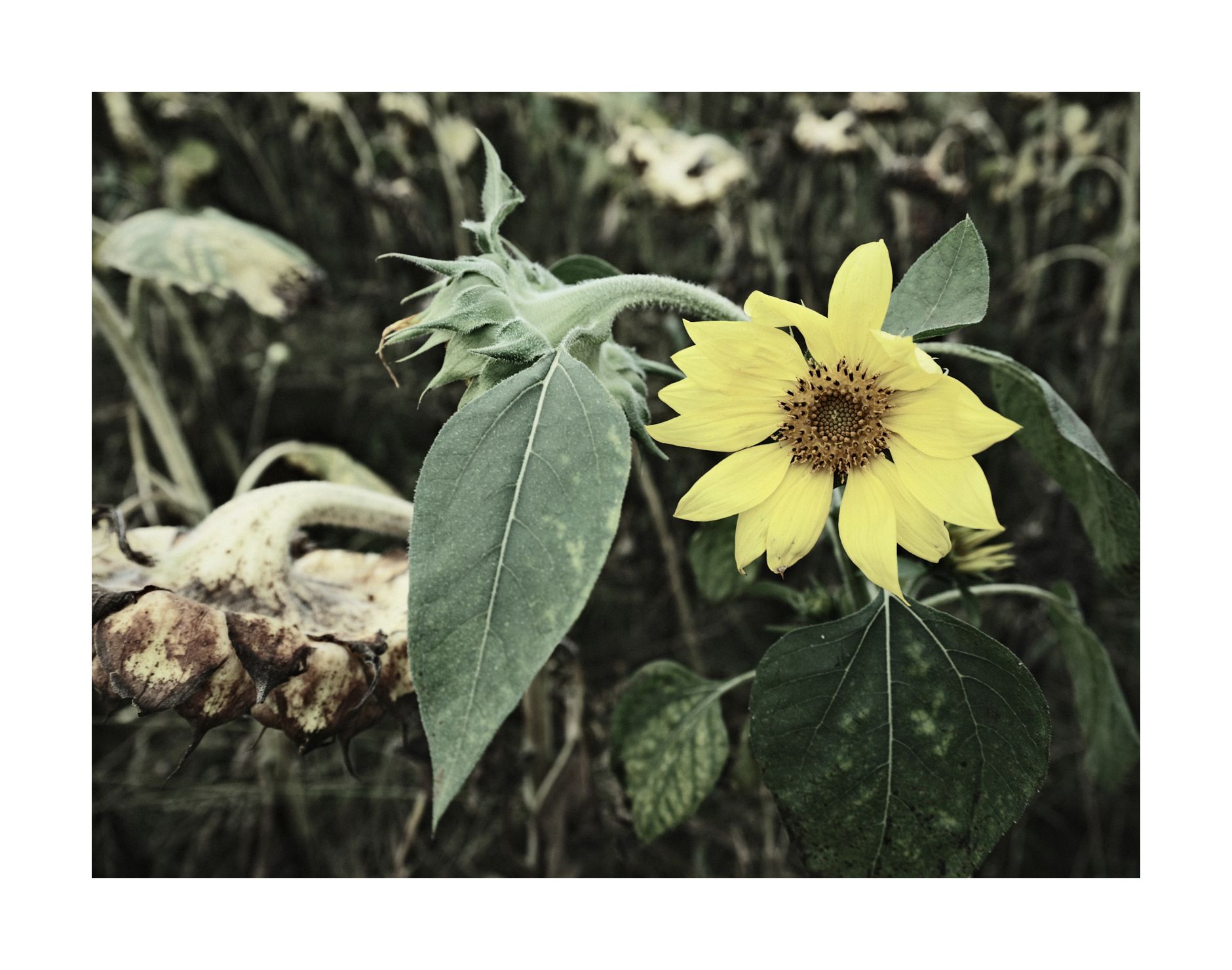 Ich bin noch gut 400 Meter von dem Feld entfernt, weiß aber jetzt schon welches JPEG-Rezept richtig ist, um das sichtbare Verwelken in Szene zu setzen. LOMO METROPOLIS heißt es und gehört eigentlich in die Stadt. Aber die zurückgedrehte Farben gepaart mit der inherenten Tristesse harmonieren hervorragend mit dem flachen Licht eines bewölkten Himmels. Ich muss nur noch irgendwie trocken über diesen tiefen Graben gelangen.