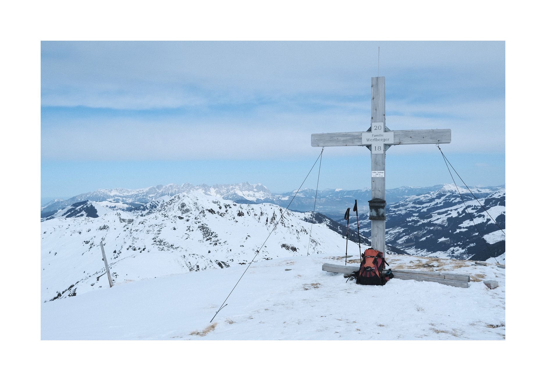 Gerade als ich mit dem Fotoprogramm beginne, gesellt sich ein einzelner Skitourengeher hinzu. Als er meine Schneeschuhe sieht, begreift er meine von der Skispur deutlich abweichende Routenwahl direkt auf der Kammlinie entlang. Wir unterhalten uns recht nett. Mit seiner tiefen, rauhen Stimme rät er mir von meinen Ambitionen auf das Gerstinger Joch ab. „Des schaffst du nie. Do kummst du zu spat abi!“ Ich überlege und starre wie gebannt auf den Rotz an seiner Nase. Hoffentlich tropft der nicht auf meine Sachen…