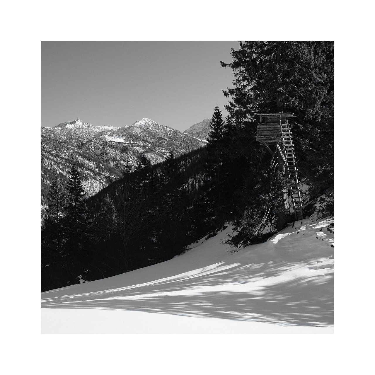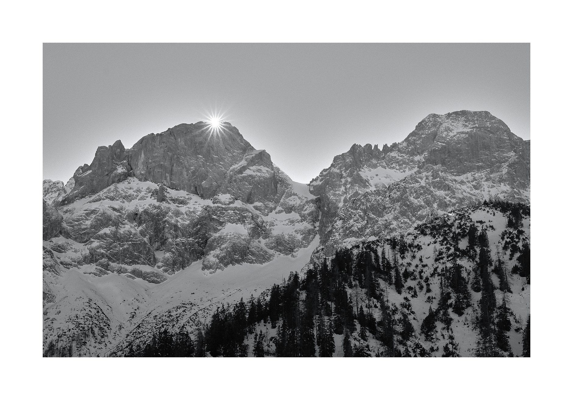 Die Sonne huscht im Hochwinter rasch über den tiefen Talboden des Rohntals. Die letzten Lichtstrahlen drücken sich noch an der Östl. Karwendelspitze vorbei, bevor sie vom Fels ihrer Südwände vollständig absorbiert werden. Es reicht noch für ein paar letzte Fotos. Eile ist geboten, denn nach Sekunden ist die besondere Lichtstimmung für immer und ein Jahr vorbei.