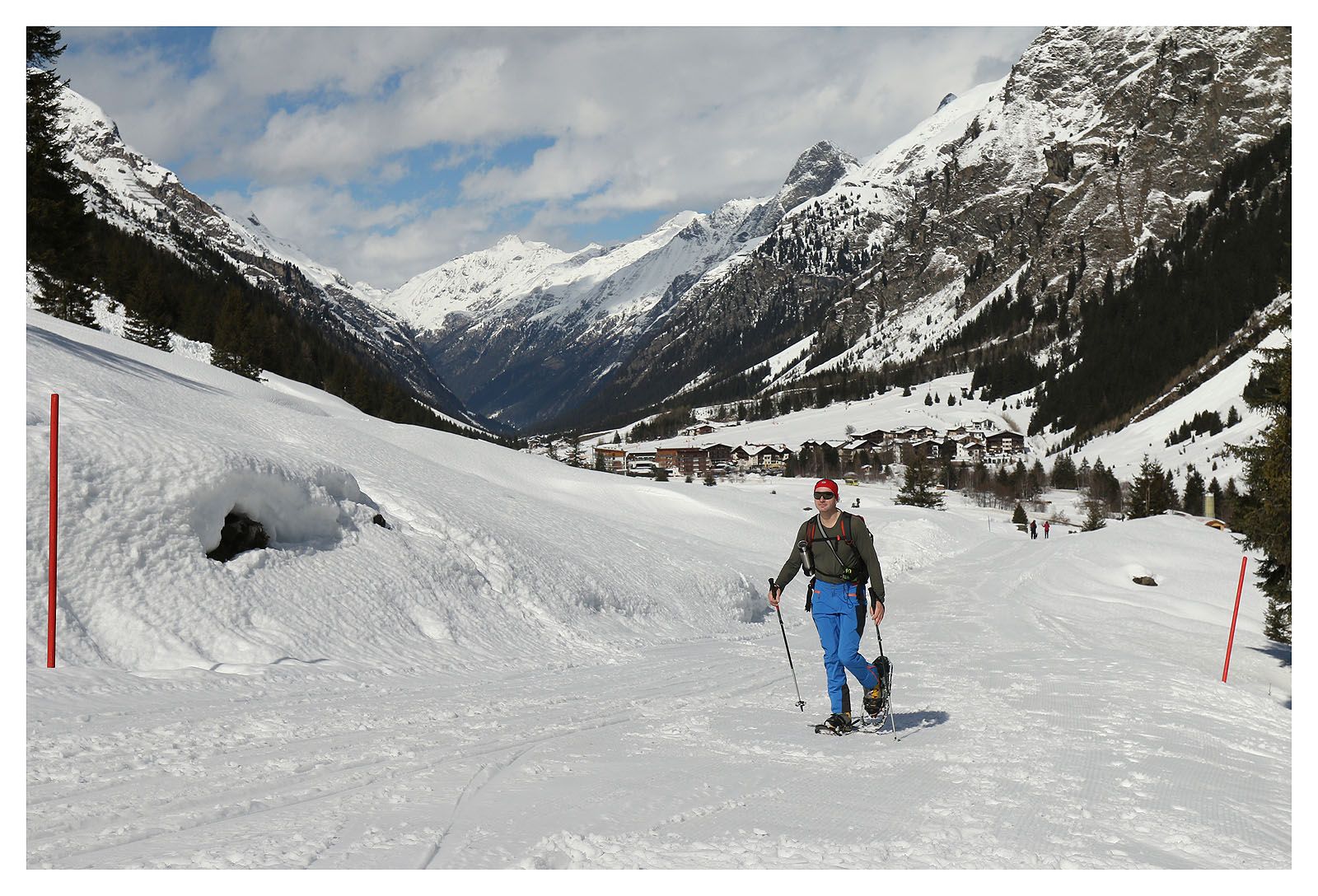 Dann geht es leider wieder an den Abstieg. Der Schnee ist irgendetwas zwischen Bruchharsch und Sulz, vielleicht auch beides zugleich. Die Hose ist zu warm, die Gamasche zu kaputt. Bei diesen Bedingungen sehen weder Skifahrer noch Schneeschuhgeher sehr elegant auf. Hauptsache abwärts!