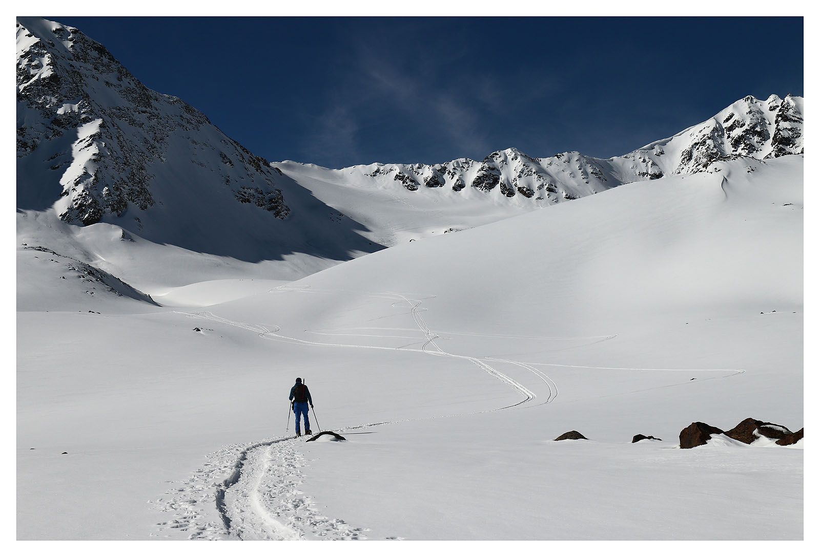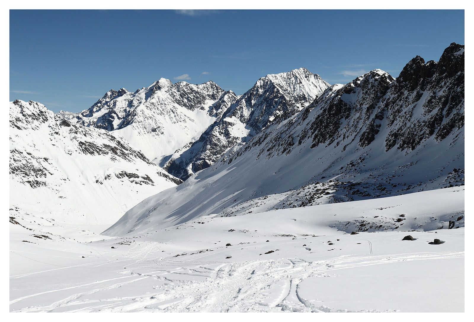 Es ist warm, schon gleich am Morgen. Es soll noch wärmer werden. Alles ist möglich, Schneebretter am Morgen und Nassschneelawinen am Nachmittag, LWS3. Wir wählen unser Tagesziel daher mit Bedacht und entscheiden uns für den Wurmtaler Kopf mit seinem langen und eher flachen Anstieg durch das Rifflbachtal.