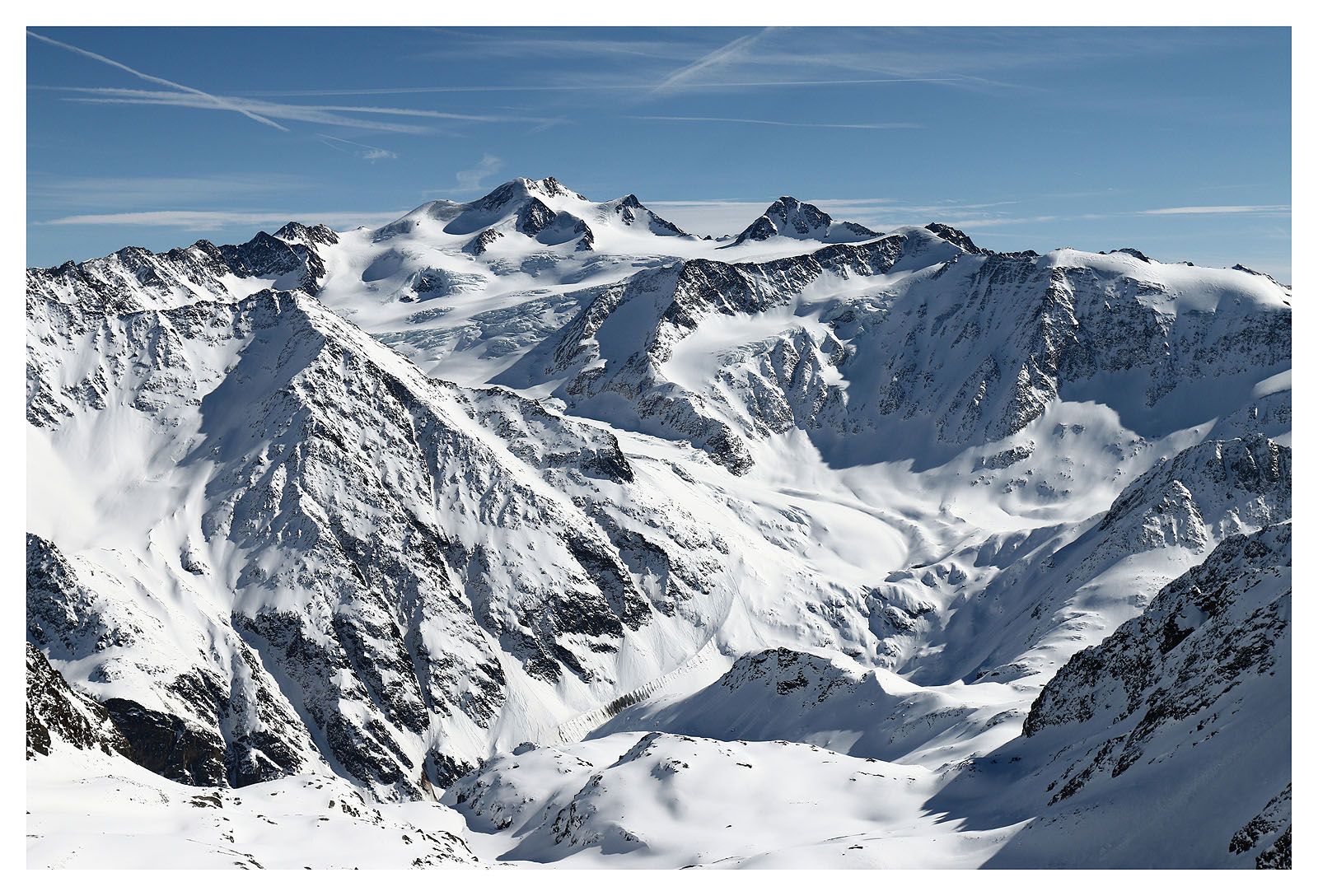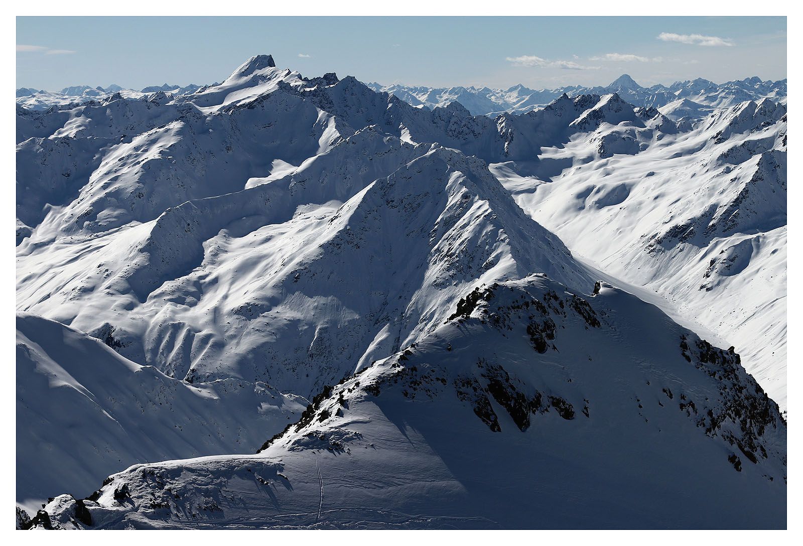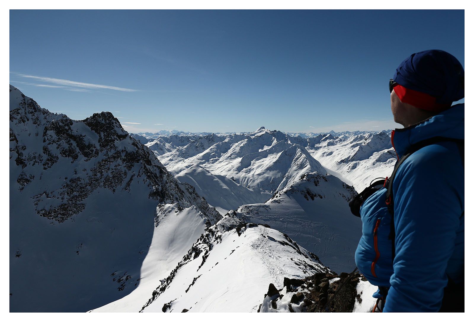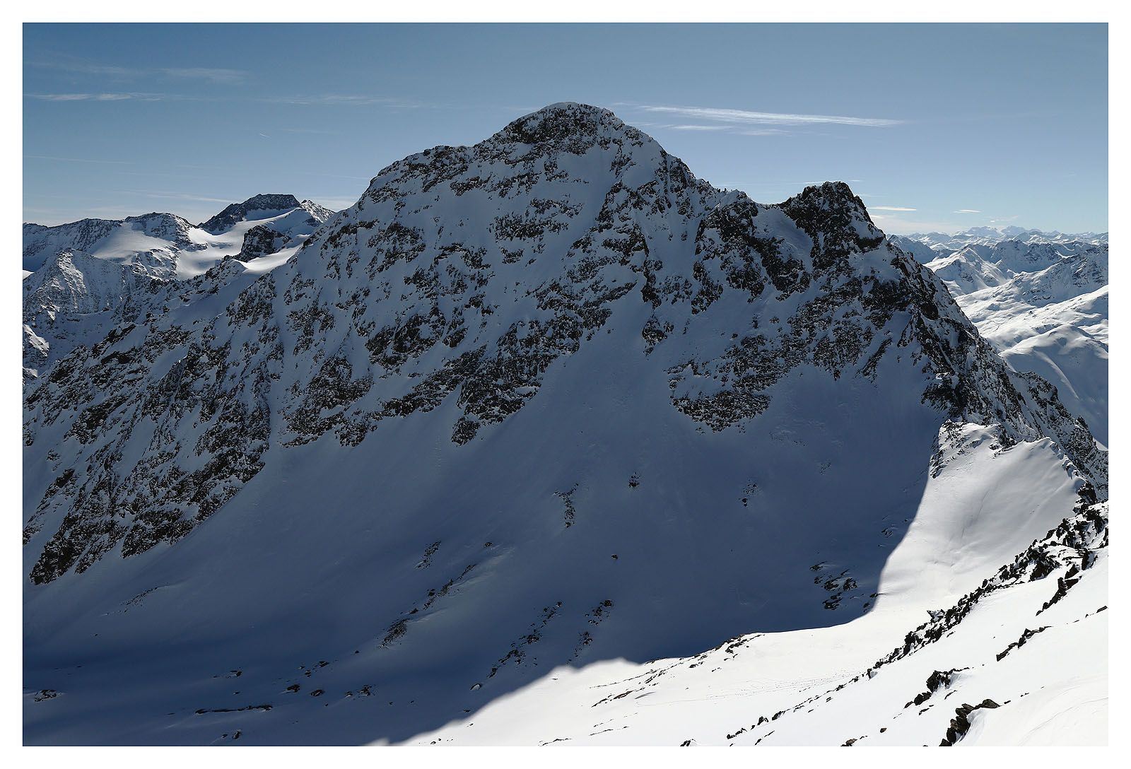 Der lange Aufstieg zum Wurmtaler Kopf lohnt sich in jedem Fall, allein der Aussicht wegen. Wir können unsere begehrten Ötztaler Eiswände bestaunen. Der Blick reicht tief bis in die Schweiz. Auch die Stubaier Alpen reihen sich abzählbar am Osthorizont auf.