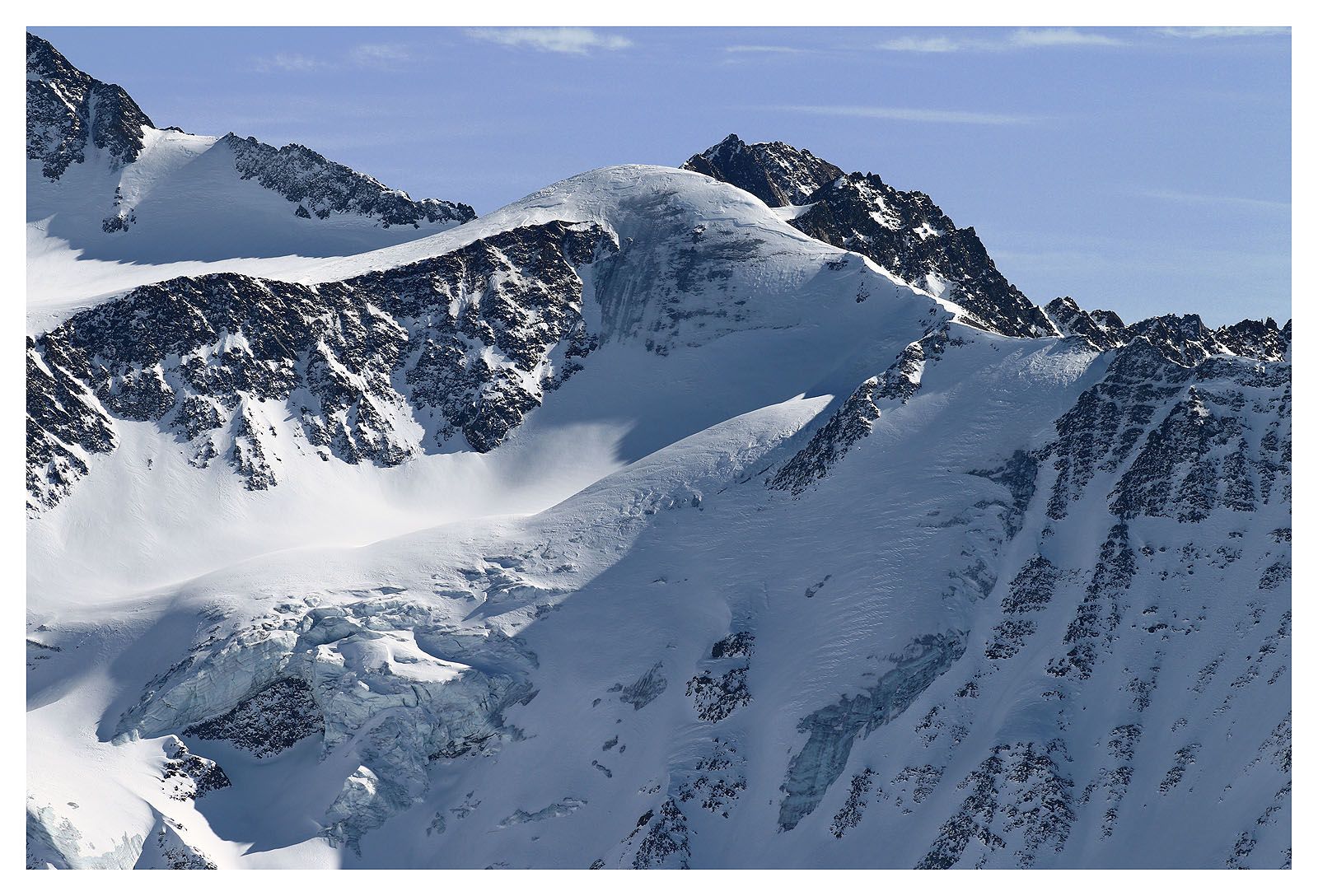 Jetzt gewinnen wir immerhin schneller Höhe. Dafür bläst der Wind böig aus allen beliebigen Richtungen. Es gibt kleine Wirbelstürme im Triebschnee.