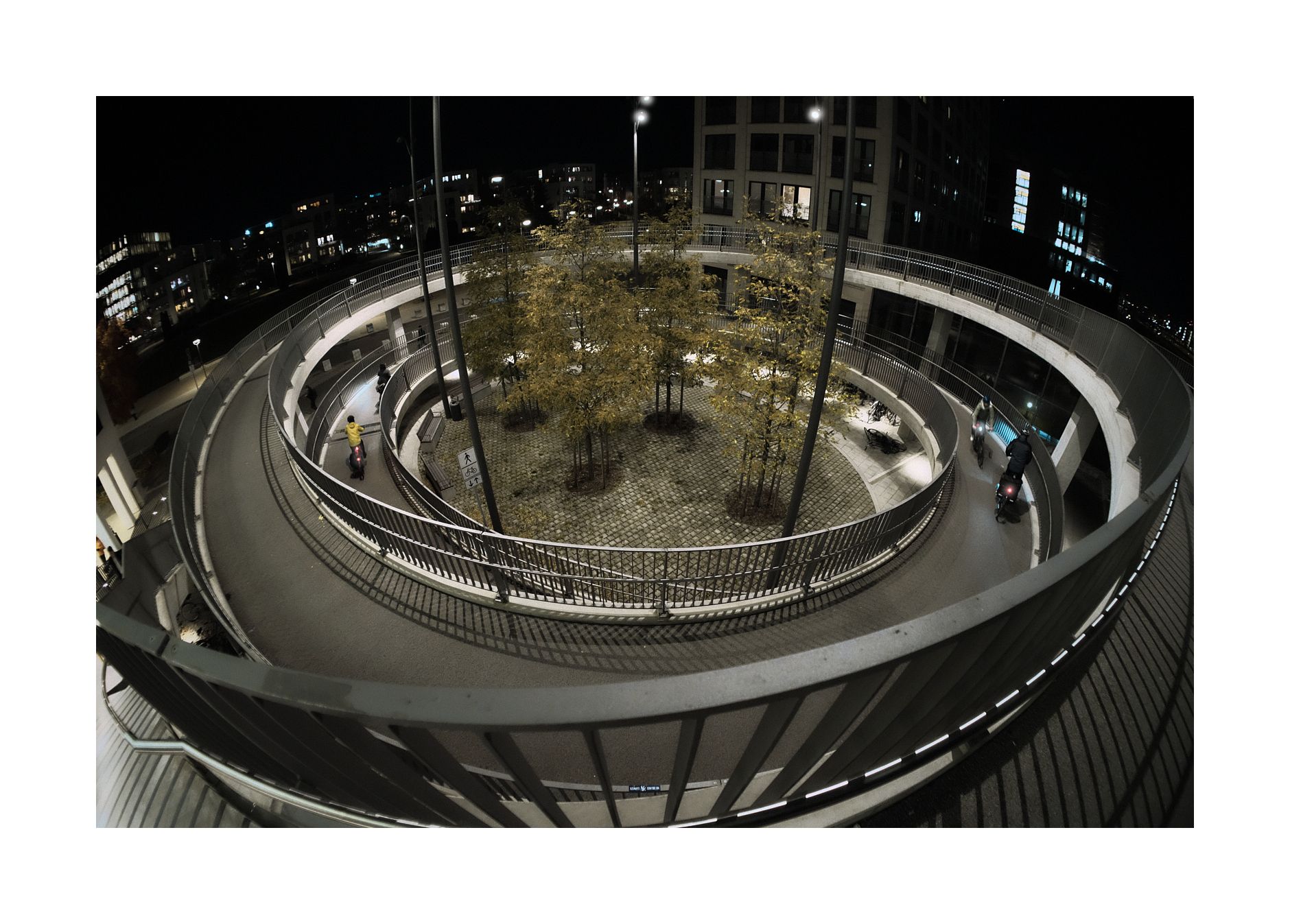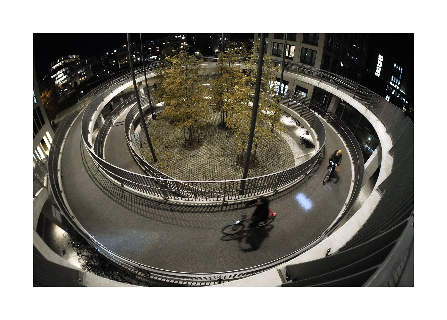Das passt sehr gut in das Fischaugenobjektiv. Ich muss ein wenig warten, bis ich mit der Konstellation der Radfahrer zufrieden bin. Dann aber gelingt mir endlich ein surrealer Beitrag zu 'night&sky' von Projekt 12.