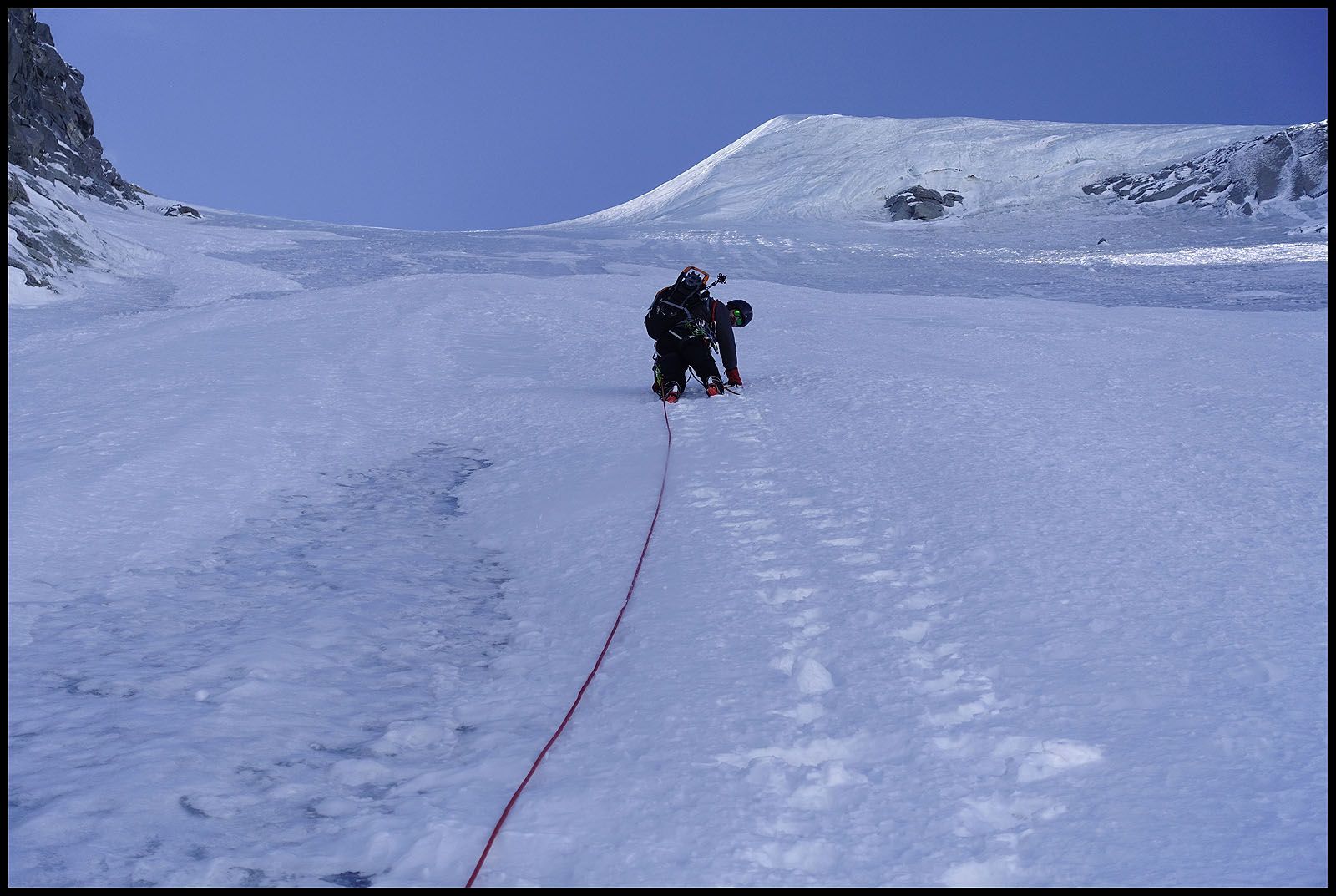Von jetzt an gibt es nur noch den Weg gerade nach oben. Frank bleibt am scharfen Ende des Seils. Berni und ich folgen am laufenden Seil (Männer am scharfen Ende nennen es auch ‚gleitendes‘ Seil). Mit insgesamt drei Tibloc an Bord gibt es viel laufendes Seil und nur wenige Pausen. Abgesehen von Einstieg und Ausstieg erleben wir auf 300m NW-Wand nur einen einzigen Standplatz. Irgendwo um diesen mittleren Standplatz herum verschwindet auch die Schneeauflage und Blankeis tritt zutage. Erst wenn die Waden so richtig abbrennen, weiß man die Leistung des Vorsteigers zu würdigen.