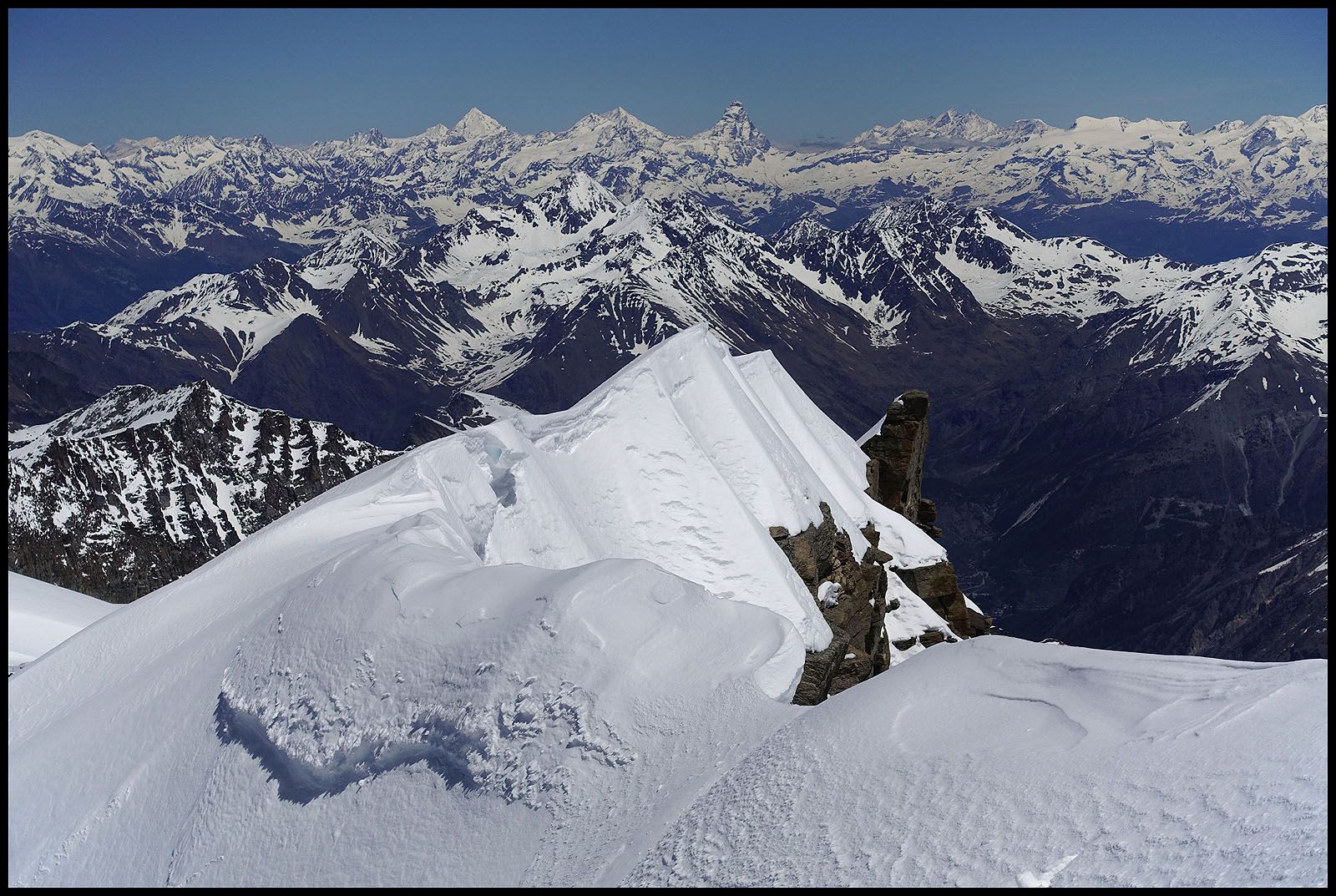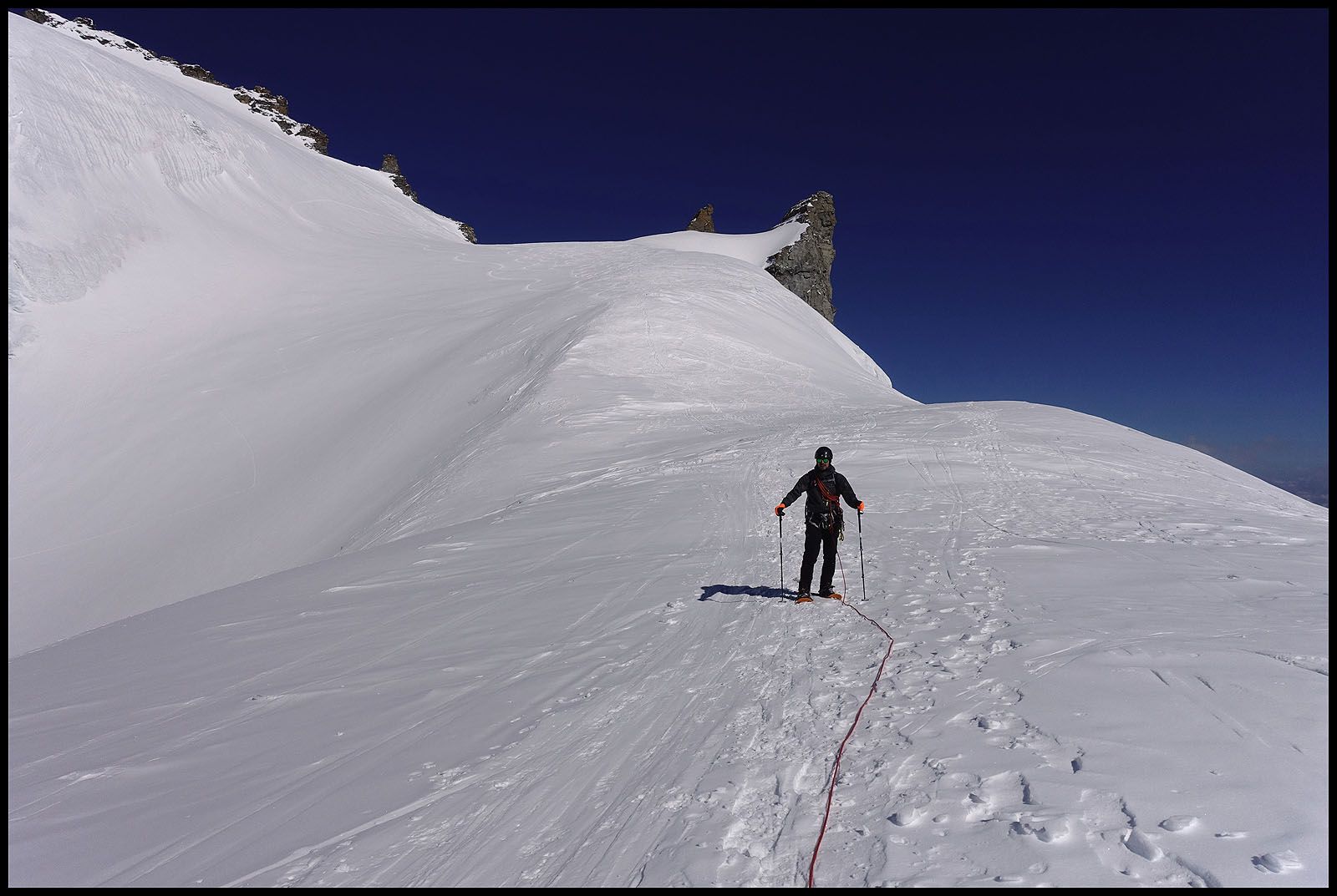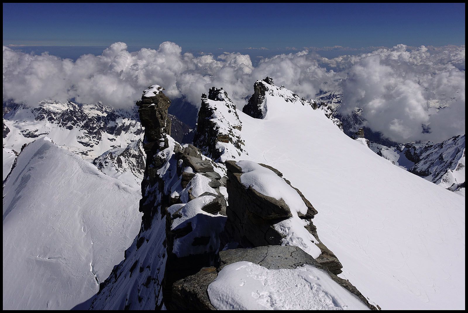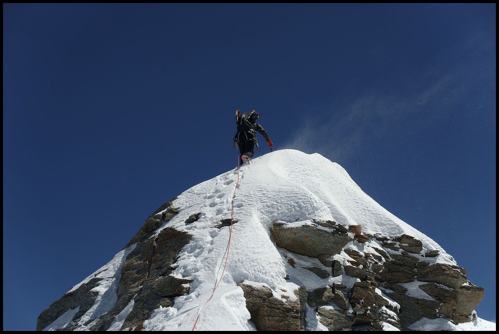 Im pfeifenden Wind halten wir uns jedoch nicht lange auf und unsere Freude zunächst zurück. Der Abstieg über das schmale Band ist jetzt nur noch ein Klacks. Schon seit längerem helfen hier zwei Bohrhaken bei der Sicherung. Jetzt aber gibt es noch mehrere, zusätzliche Spiralhaken, die den sonst üblichen Massenauftrieb an diesem „leichten“ Viertausender möglich machen.
