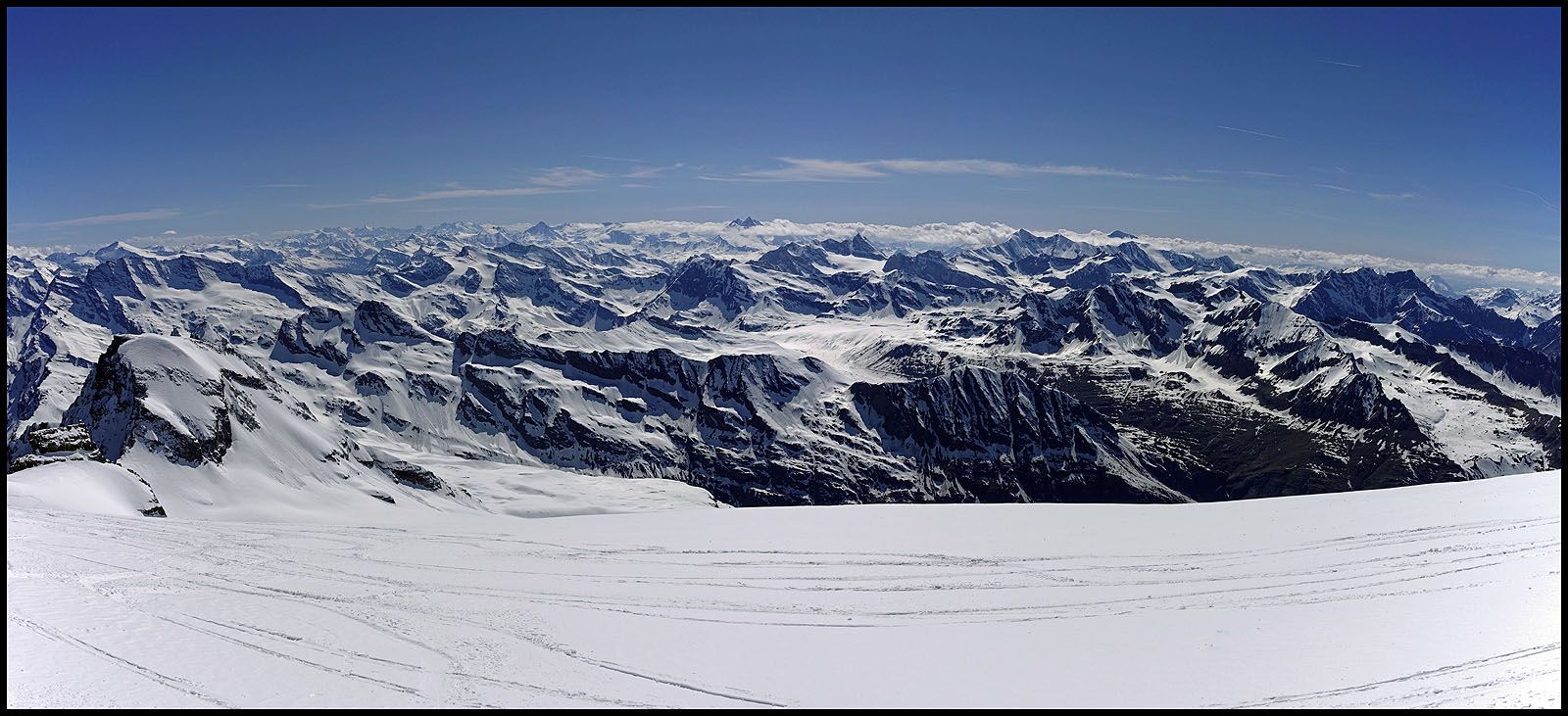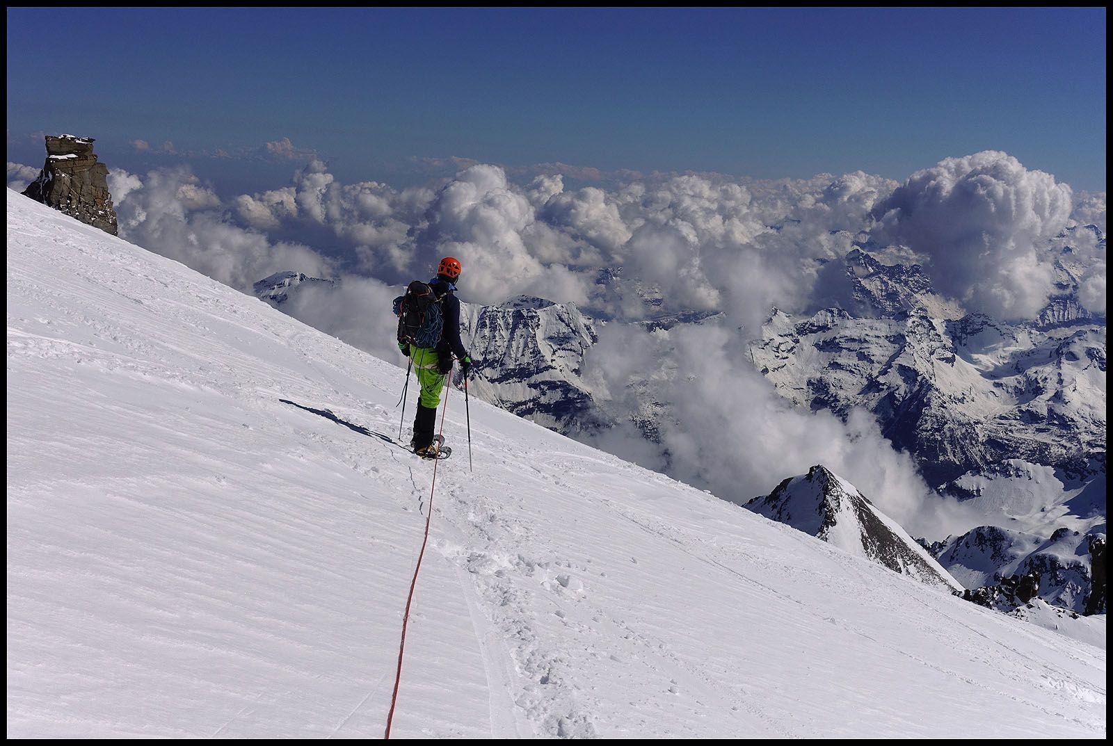 Im Schnee angekommen wechseln wir von Steigeisen auf Schneeschuhe. Frank gibt zur Feier seines ersten Viertausenders jedem ein kleines Toblerone aus. Der Gaumen schmerzt vor lauter Durst. Die letzten Flüssigkeitsreste werden zusammengekratzt. Der weitere Abstieg im wässrigen Schnee wird noch einmal drei Stunden andauern.