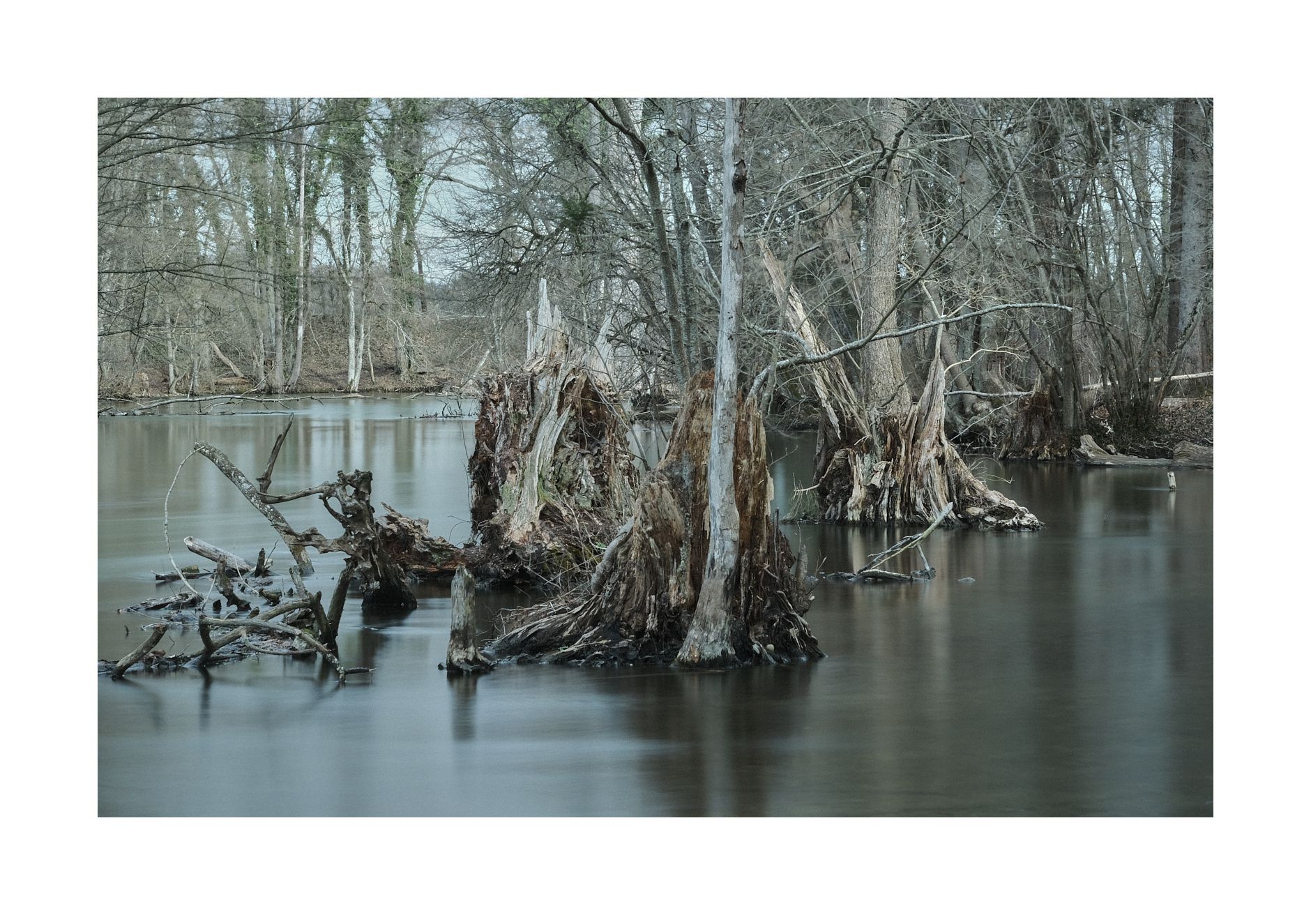 Das ich noch etwas kann, stelle ich zwei Flussbiegungen später fest. Abgestorbene Bäume stehen in der "wilden" Würm. Mit Teleobjektiv (f=70mm; 105mm KB-Äquivalent) und Big Stopper ensteht so eine 30s lang belichtete Fotografie. Durch die hohe Belichtungszeit ist das "aufgewühlte" Wasser beruhigt worden. Die abgestorbenen Bäume springen sofort ins Auge. Kaum etwas lenkt vom eigentlichen Motiv ab. Wenn mir das nur einmal mit dem Weitwinkel gelingen würde!