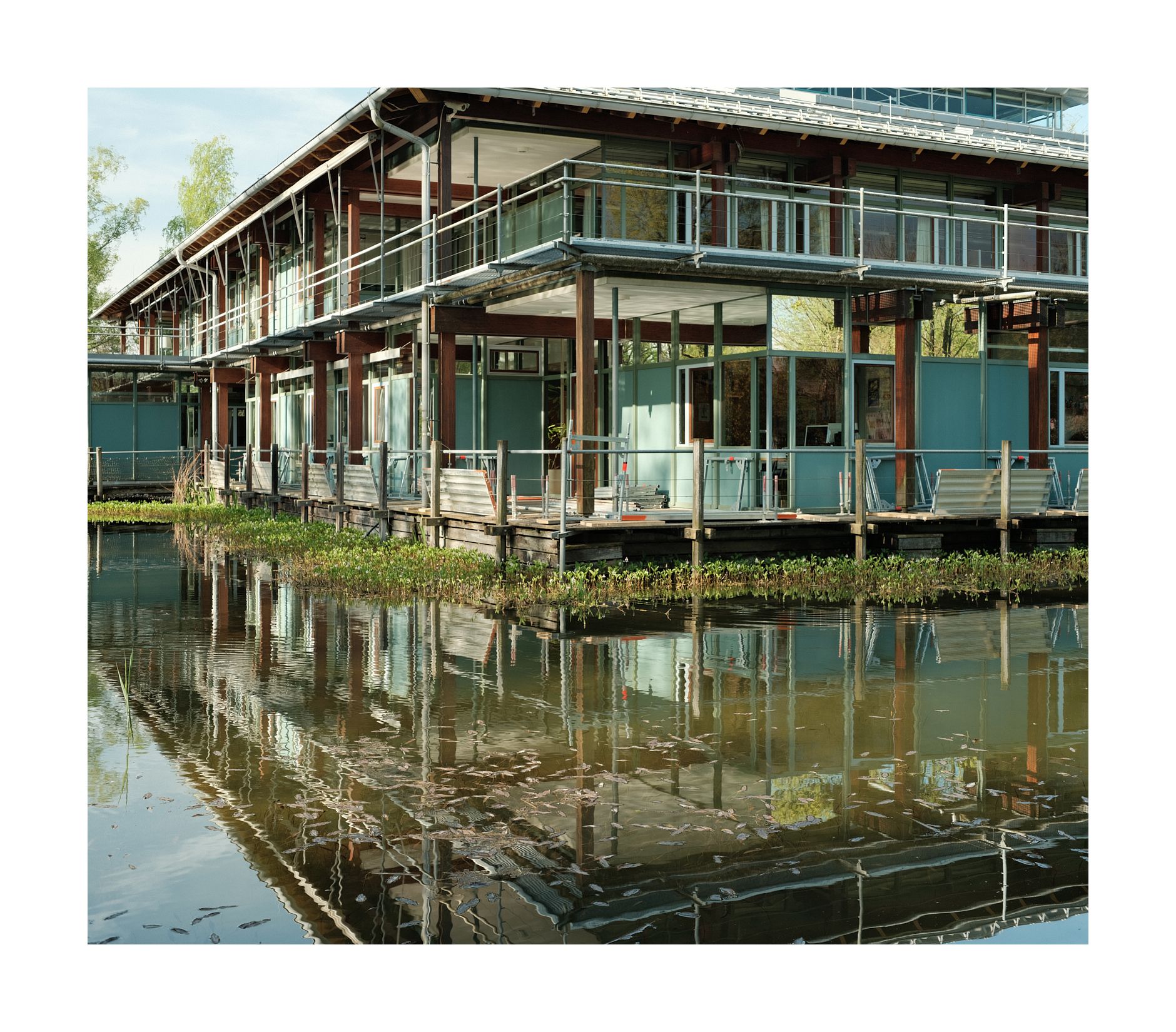 Als ich über die Auslaufzone der A952 trete, finde ich mich in einer ganz anderen Welt wieder. Ich wechsle vom Modus Landschaftsfotografie in den Modus Architekturfotografie. Das Gebäude des Landratamtes Starnberg hat es mir dabei besoders angetan. Es ist weniger Haus denn Hausboot! Ein mächtiger Fisch durchschneidet mit seiner Rückenflosse die Wasseroberfläche. Eine Ente schnattert empört und fliegt davon. Fast wäre der Start missglückt, da erhebt sie sich wie ein Rosinenbomber über den Beckenrand.