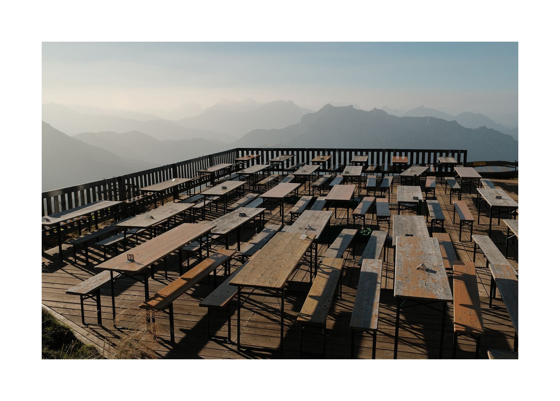 Aufbruch zur Hütte. Draußen sitzt keiner mehr. Der Fön weht kalt und ungemütlich. Die Hütte drinnen wirkt etwas unordentlich. Die Wirtin und ihren Schwiegervater ordne ich mal gleich in die Schublade etwas seltsamer und unangenehmer Zeitgenossen ein. Aber was soll's, ich übernachte ja auf einer Hütte und nicht im Kofferaum.