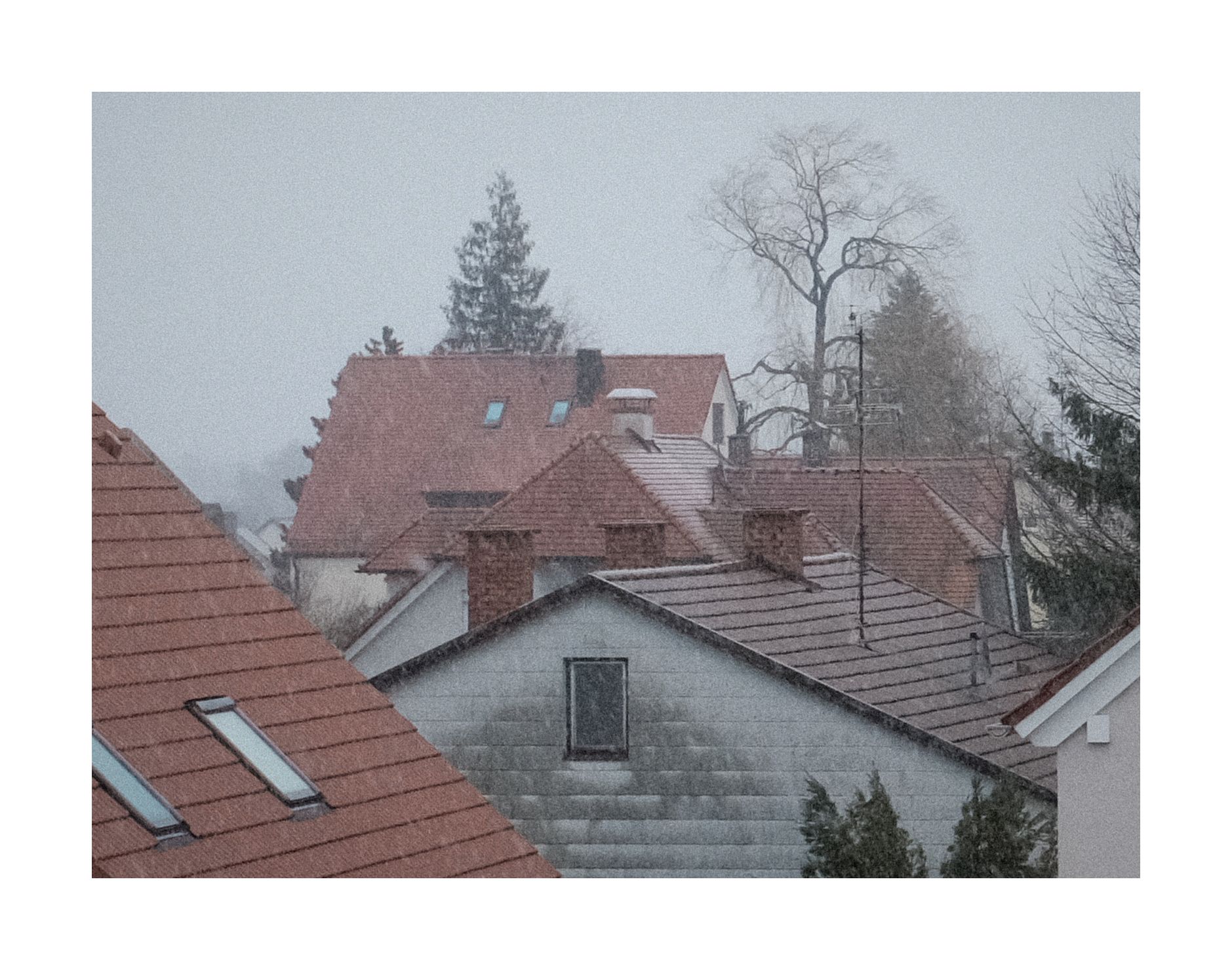 Das allererste Foto entsteht mit dem sehr weiten 25er. Diese Aufnahme ist zunächst sehr langweilig. Zum Überprüfen der Schärfe zoome ich jedoch schnell hinein. Dabei entdecke ich im linken oberen Drittel eine Dachlandschaft, die im Schmuddelwetter und durch das digitale "Filmkorn" fast verschwimmt.